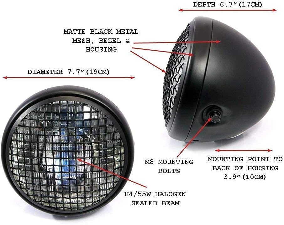 Alchemy Parts 7.7" Mattschwarz Netz Grill H4 55w Metall Projekt Motorrad Scheinwerfer Retro Vintage