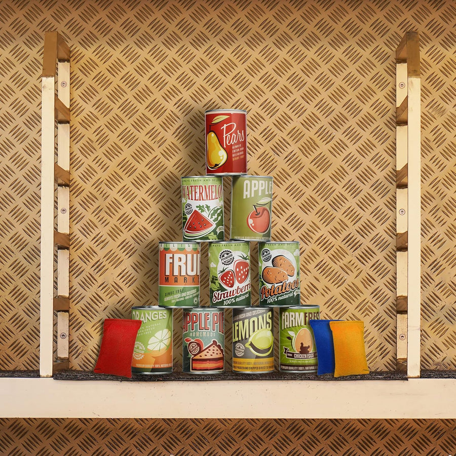 Relaxdays Dosenwerfen für Kinder, Büchsenwerfen Garten, 10 Blechdosen & 3 Säcke, Wurfspiel für Kinde