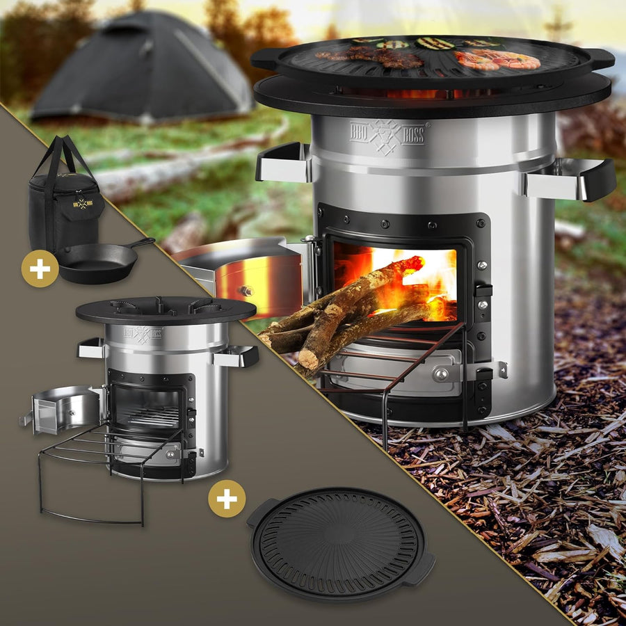 BBQ#BOSS Raketenofen mit Grillpfanne, Tragetasche, Silber, Edelstahl, Gusseisen Grillplatte, Camping