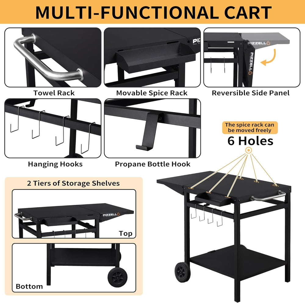PIZZELLO Outdoor Grill Esswagen Beweglicher Pizzaofen Trolley BBQ Ständer Doppelregal Outdoor Workta