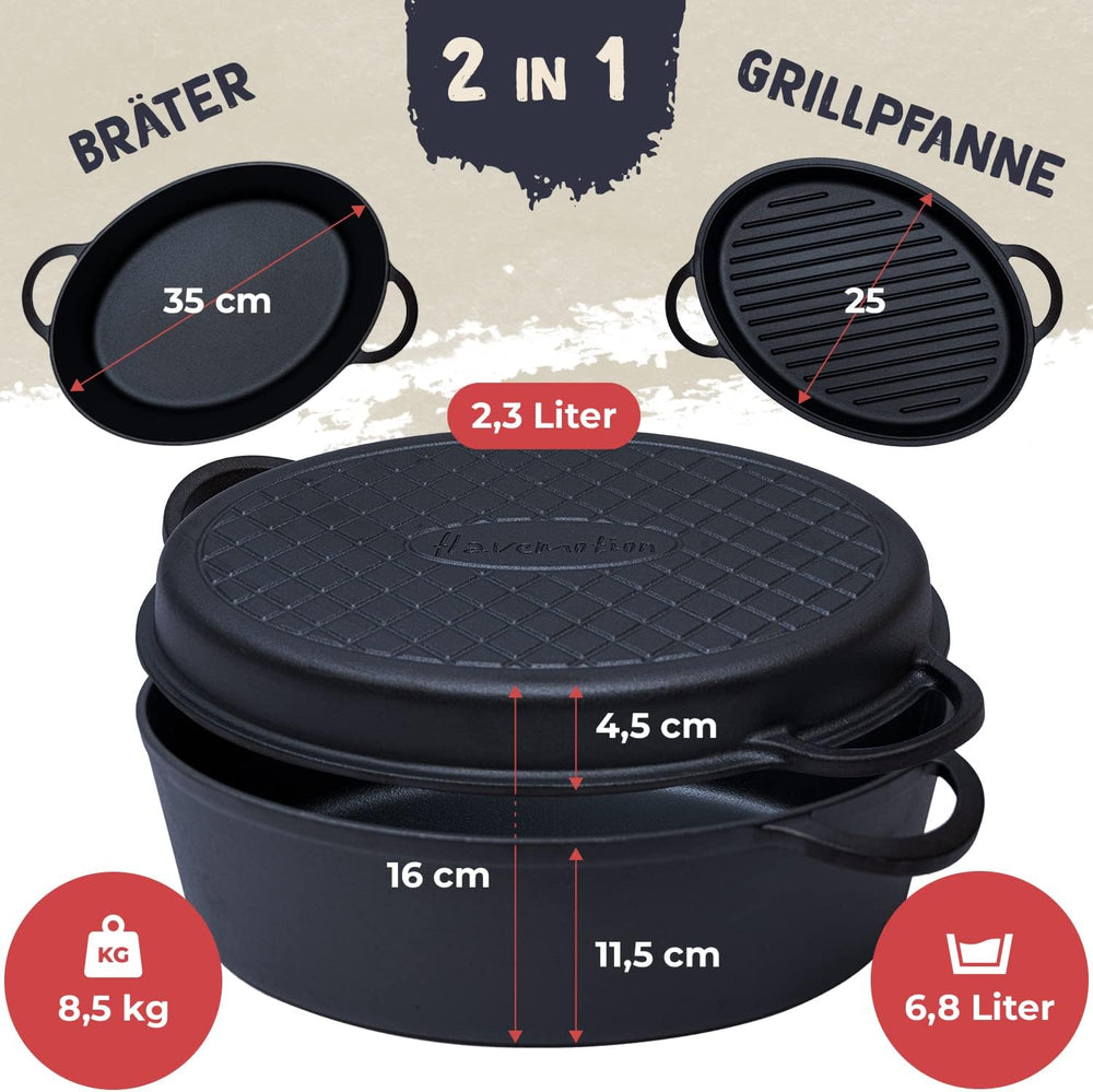 FLAVEMOTION Gusseisen Bräter mit Deckel als Grillpfanne (2in1) 35cm, 9,1L, 8,5kg - Topf, Schmortopf