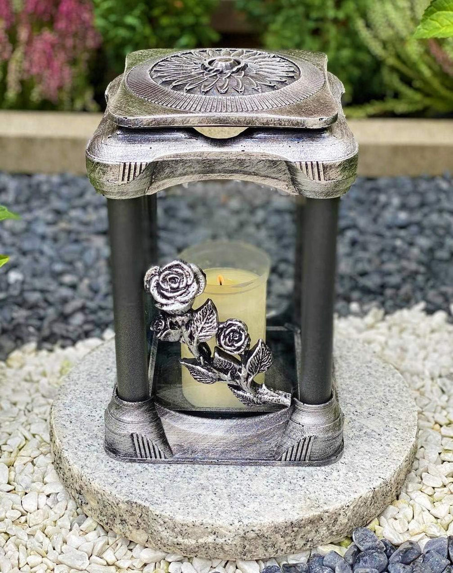 Grablampe Handmade NEU Rose-Motiv Silber Grablicht Grabkerze Grabdekoration Grabschmuck Gartenlampe