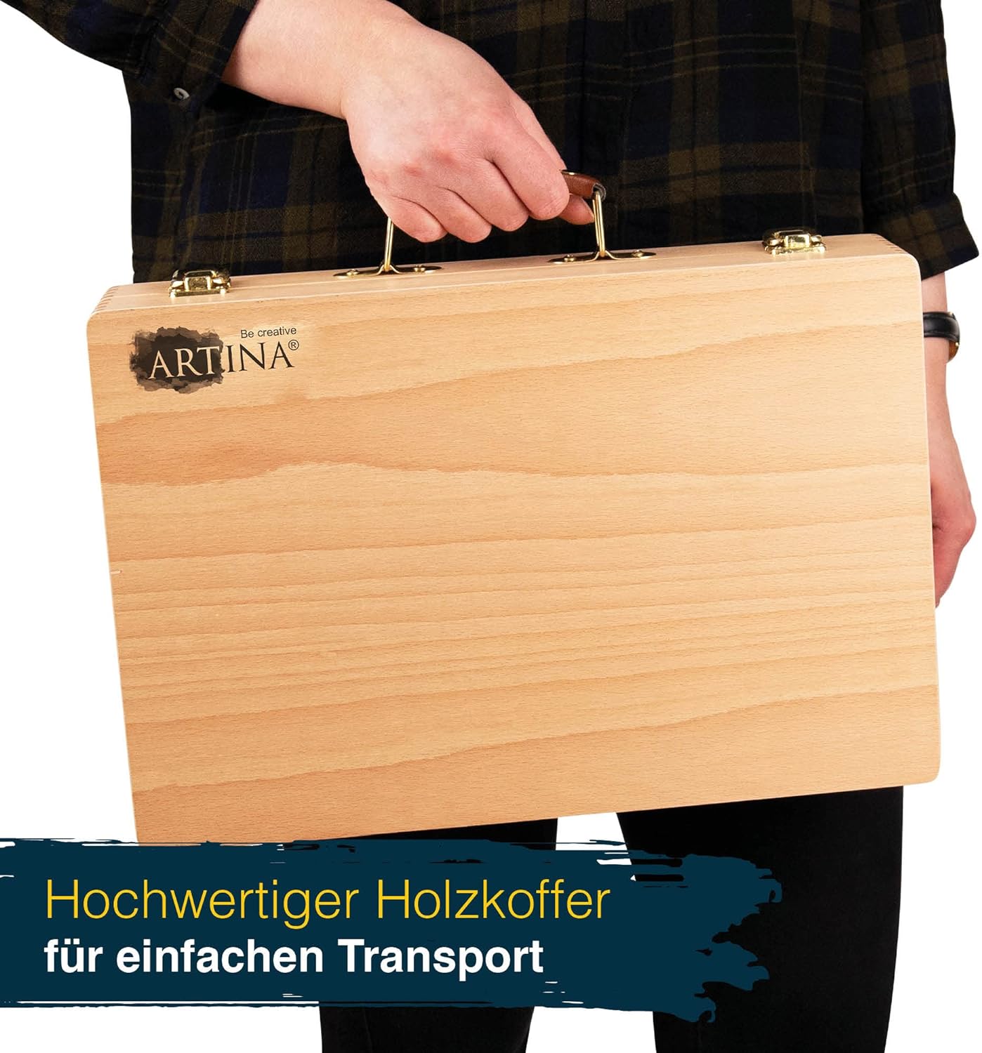 - 𝗥𝗢𝗕𝗨𝗦𝗧𝗘𝗥 𝗙𝗦𝗖 𝗛𝗢𝗟𝗭𝗞𝗢𝗙𝗙𝗘𝗥 –Der Künstlerkoffer ist aus robustem FSC Buchenholz gefertigt. Der leichte Holzkoffer verfügt über die Masse 40x28x10cm sowie 2 separaten Ebenen zur Aufbewahrung. Edle Metallbeschläge runden den Look vom grossen Malkoffer ab. Der praktische Tragegriff sorgt unterwegs für einen angenehmen Transport. Das Holz stammt aus nachhaltiger Wirtschaft, Beweis dafür ist das FSC-Zertifikat (FSC N002767).