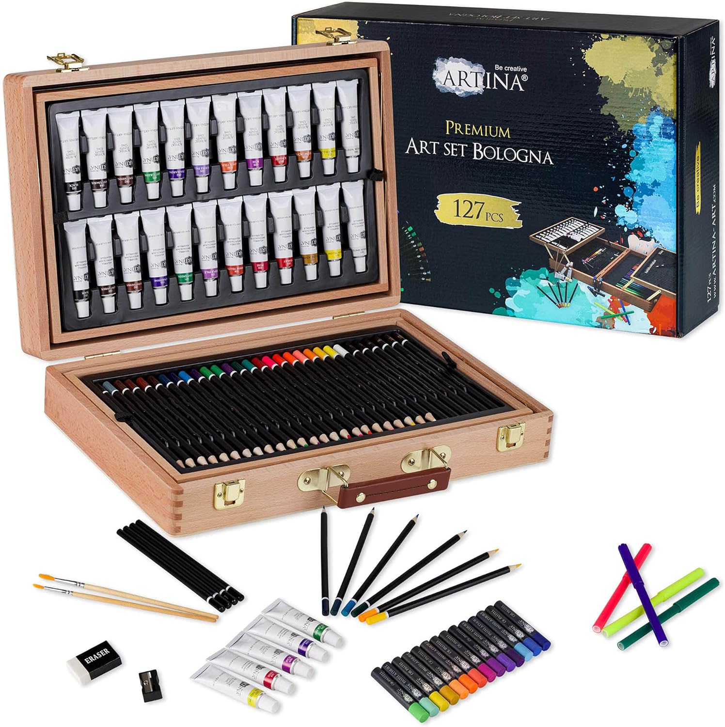 - 𝗠𝗔𝗟𝗦𝗘𝗧 𝗙Ü𝗥 𝗘𝗥𝗪𝗔𝗖𝗛𝗦𝗘𝗡𝗘 – Ob Acrylfarben Set, Pastellkreide, Fineliner, Buntstifte oder Bleistifte – mit dem Artina XXL Malset können Sie sich nach Herzenslust künstlerisch austoben. Die Malfarben und Stifte verblassen nicht und haben eine gute Deckkraft.