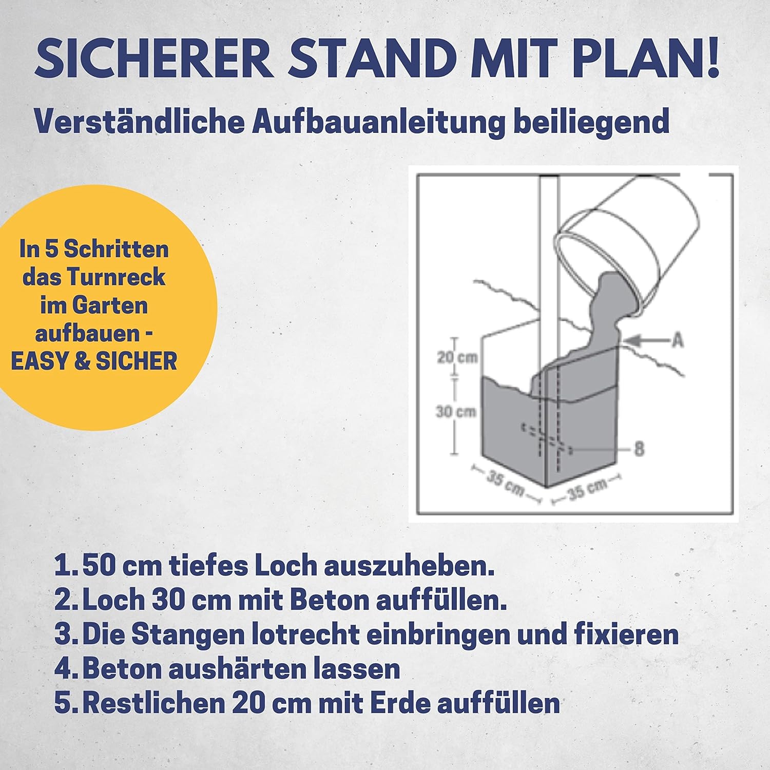 - SICHERER AUFBAU - Turnstangen-Aufbau-Anleitung für sicheren Stand der Reckstange im Garten. Mit detaillierter Anleitung für die Fundamenterstellung für lange Lebensdauer