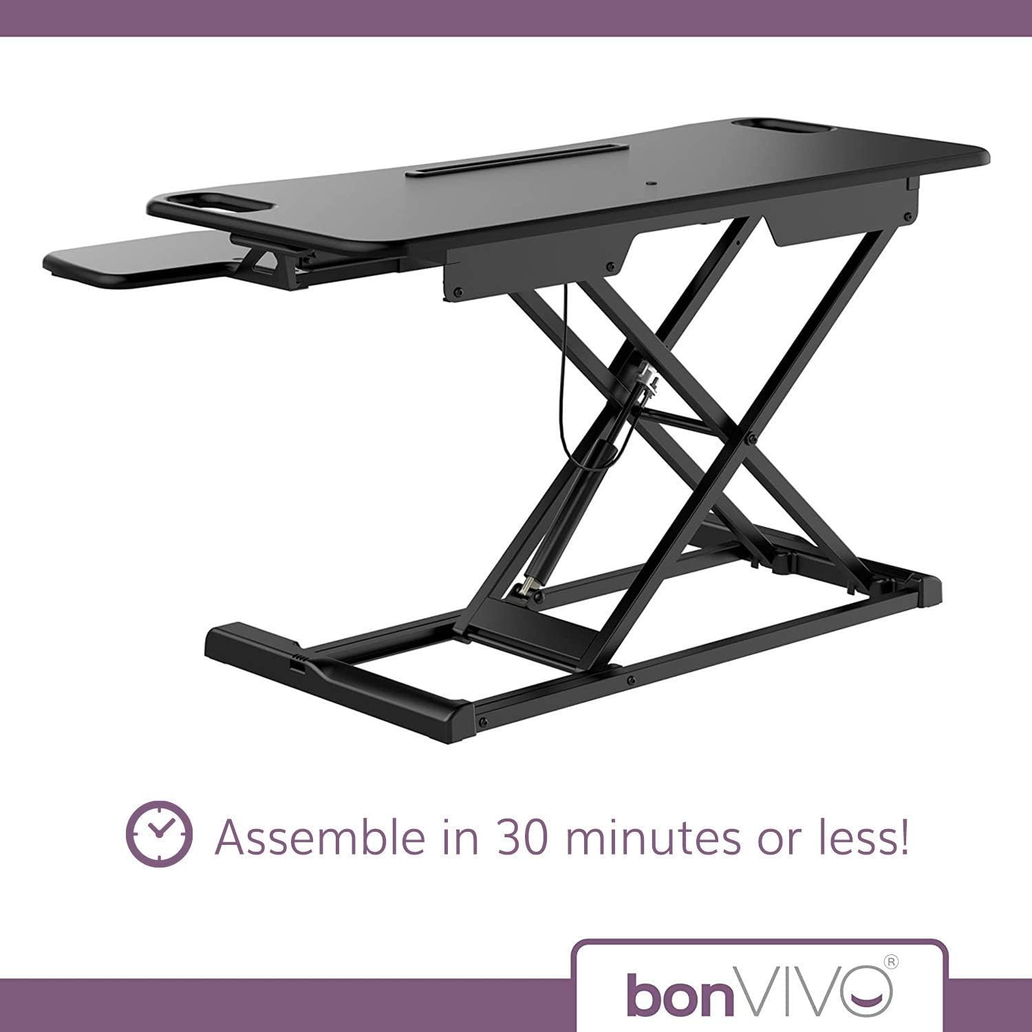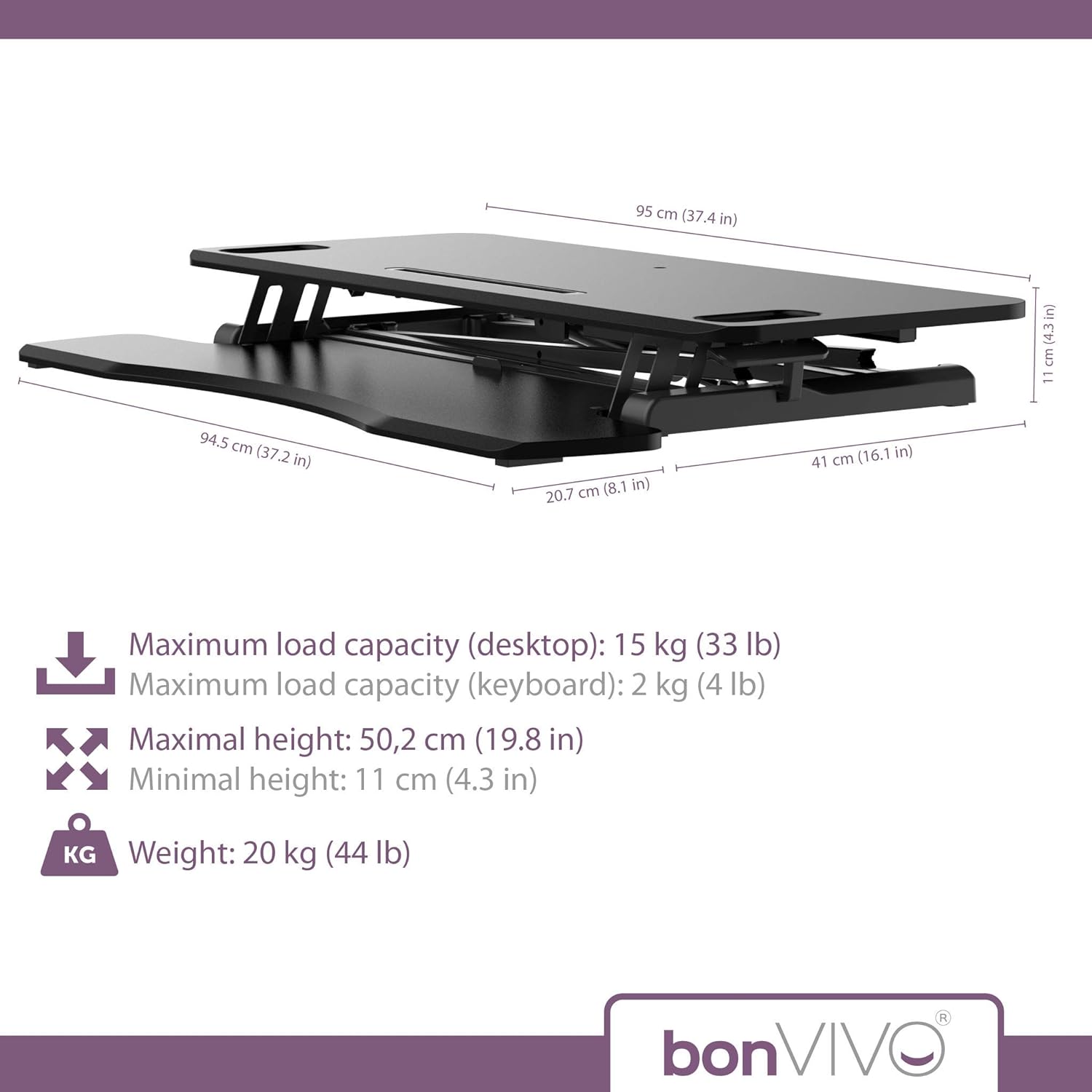 - Produktmasse: Der Stehtisch Aufsatz misst 95 cm x 40 cm und kann auf eine beliebige Höhe zwischen 11 cm und 50,5 cm eingestellt werden. Die Tastaturablage misst 94,5 cm x 30 cm.