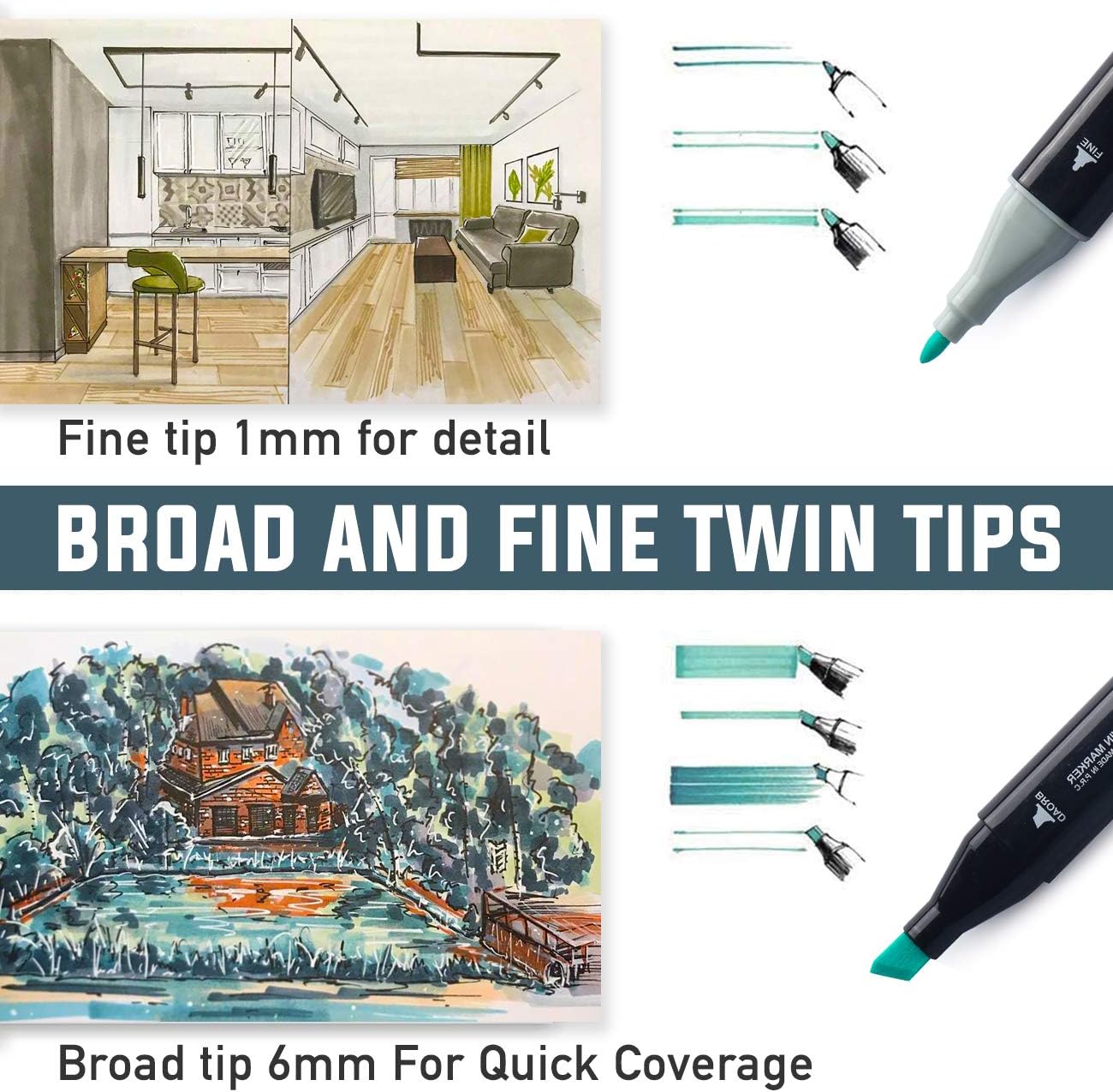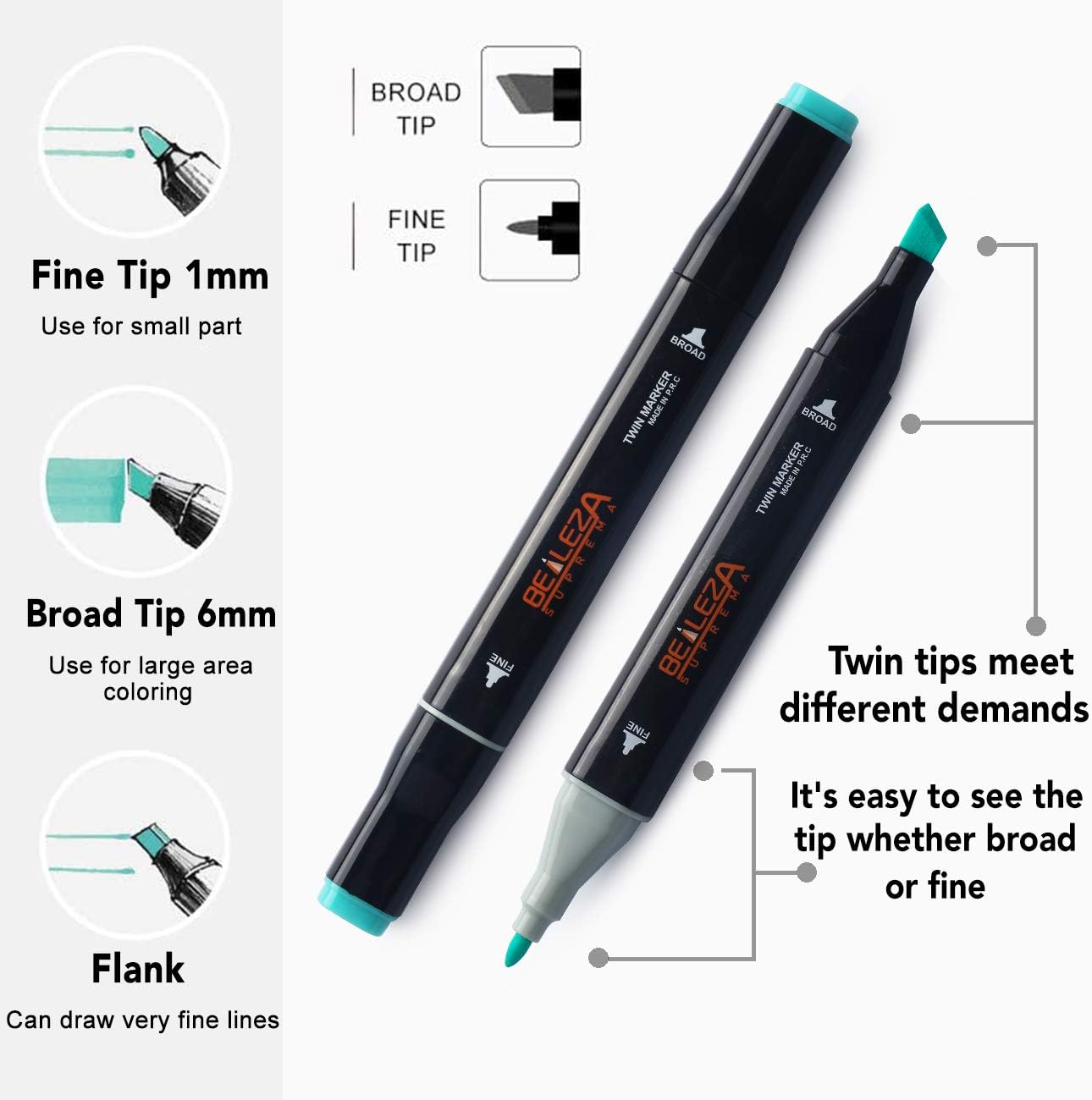 - 👑Dual Tips Twin: Mit dem Art Markers Design mit zwei Spitzen können Sie dicke und dünne Linien erstellen, ohne die Alkoholmarker zu ändern. Enthält feine Spitzen mit 1 mm und breite Spitze mit 6 mm Doppelspitzen zum präzisen Hervorheben, Skizzieren und Unterstreichen. Dünne Markierungen können zum Schreiben und Einhaken von Linien verwendet werden, während dicke Kunstmarker Professional zum Zeichnen und Färben geeignet sind.