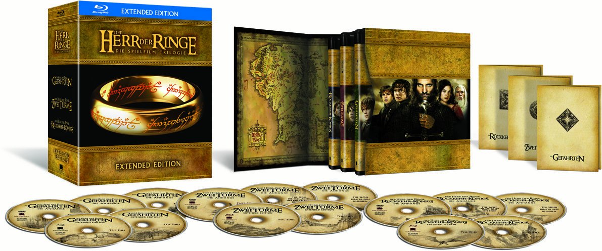 PRODUKTBESCHREIBUNGEN PRODUKTBESCHREIBUNG Hochwertiger Sammlerschuber mit magnetischem Verschluss * Drei Elite-Cases mit jeweils 5 Discs Die mit Spannung erwartete Extended Edition erscheint auf Deutsch und Englisch im 6.1 DTS-HD MA-Ton und enthält eine neue Abtastung von Der Herr der Ringe: Die Gefährten, remastered unter Verwendung der ursprünglichen 2k-Digital-Dateien. Die Collection enthält über 26 Stunden Specials, wobei die Hinter-den-Kulissen Dokumentationen von Costa Botes die Highlights bilden: Dieser Filmemacher bekam von Peter Jackson die beispiellose Genehmigung, die Dreharbeiten aller drei Filme zu begleiten. So gelang es Costa Botes, unmittelbare, mitreissende Eindrücke am Set mit der Kamera festzuhalten. Seine besondere Erzähltechnik – er lässt die Bilder für sich selbst sprechen – ergibt einen intimen und offenherzigen Backstage-Report mit all den Problemen, Vorbereitungen und sich formenden Freundschaften während der Produktion eines der grössten Kinoabenteuer aller Zeiten. Die abendfüllenden Dokumentarfilme sind insgesamt über 4,5 Stunden lang und konzentrieren sich auf komplexe Probleme und Situationen, mit denen die Filmemacher, Darsteller und Teammitglieder während der Dreharbeiten umgehen mussten. Aber auch die komischen Eskapaden und persönlichen Eindrücke am Set kommen nicht zu kurz. Costa Botes’ Dokus ergänzen die gefeierten Specials von Michael Pellerin, die bereits im Rahmen der ursprünglichen Veröffentlichungen der erweiterten Fassungen zu sehen waren. Dadurch ist dies die umfassendste Der Herr der Ringe-Zusammenstellung überhaupt. Die Der Herr der Ringe-Filme erhielten insgesamt 30 Oscar-Nominierungen und gewannen rekordträchtige 17 Oscars – der dritte Film wurde als Bester Film sowie für die Regie, das Drehbuch nach einer Vorlage und in acht weiteren Kategorien ausgezeichnet. Jacksons Filmtrilogie ist die Verfilmung der Romanbestseller von J.R.R. Tolkien, eine epische Reise von Menschen, Hobbits, Elben, Zwergen und den anderen Wesen und Kulturen in Mittelerde. Die Filme zeigen den Kampf Gut gegen Böse mit fantastischen Spezialeffekten und einem starken emotionalen Zentrum – es geht um unzertrennbare Freundschaften und die Opfer, die während des drohenden Untergangs von Mittelerde gebracht werden müssen. Entsprechend der Länge der einzelnen erweiterten Filmeditionen und damit jeder Film mit der bestmöglichen Bildqualität gezeigt werden kann, wird jeder Film auf zwei Blu-ray-Discs präsentiert. WARNHINWEISE ages_16_and_over