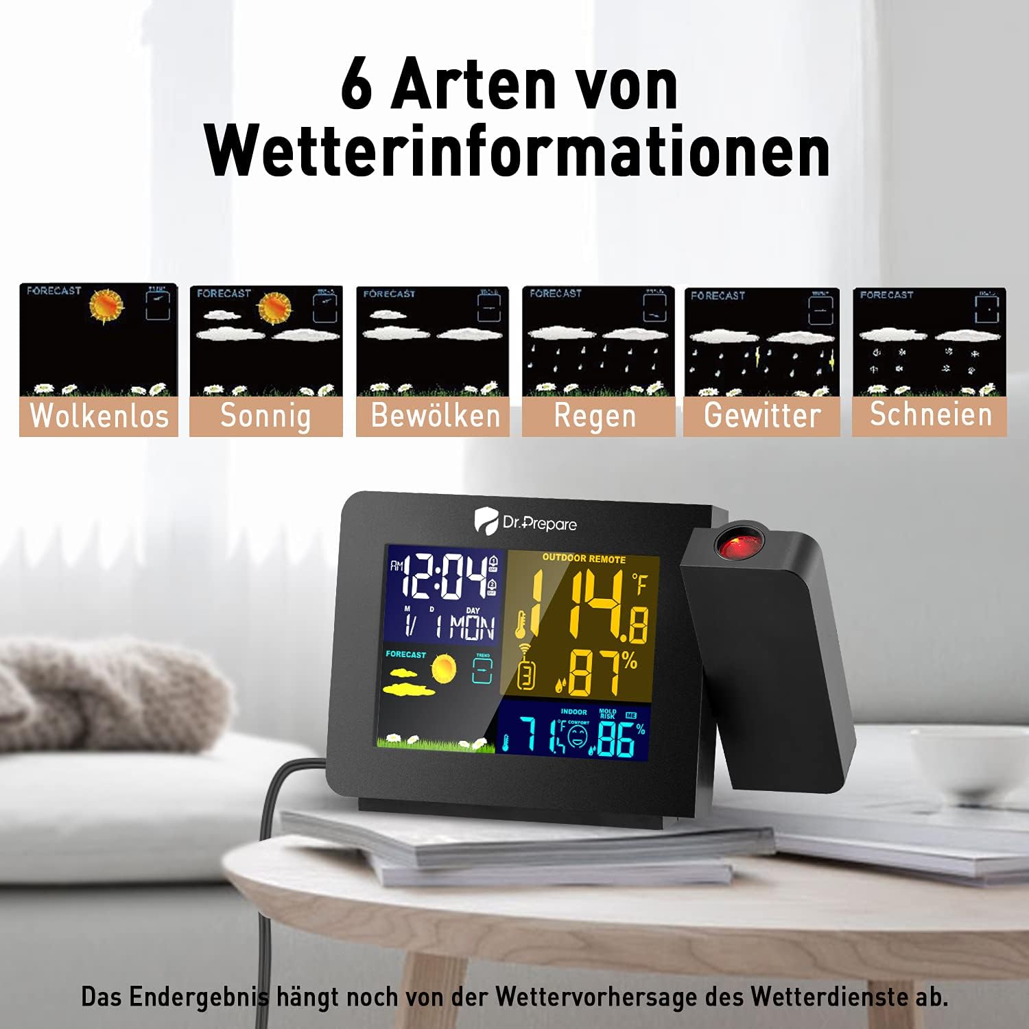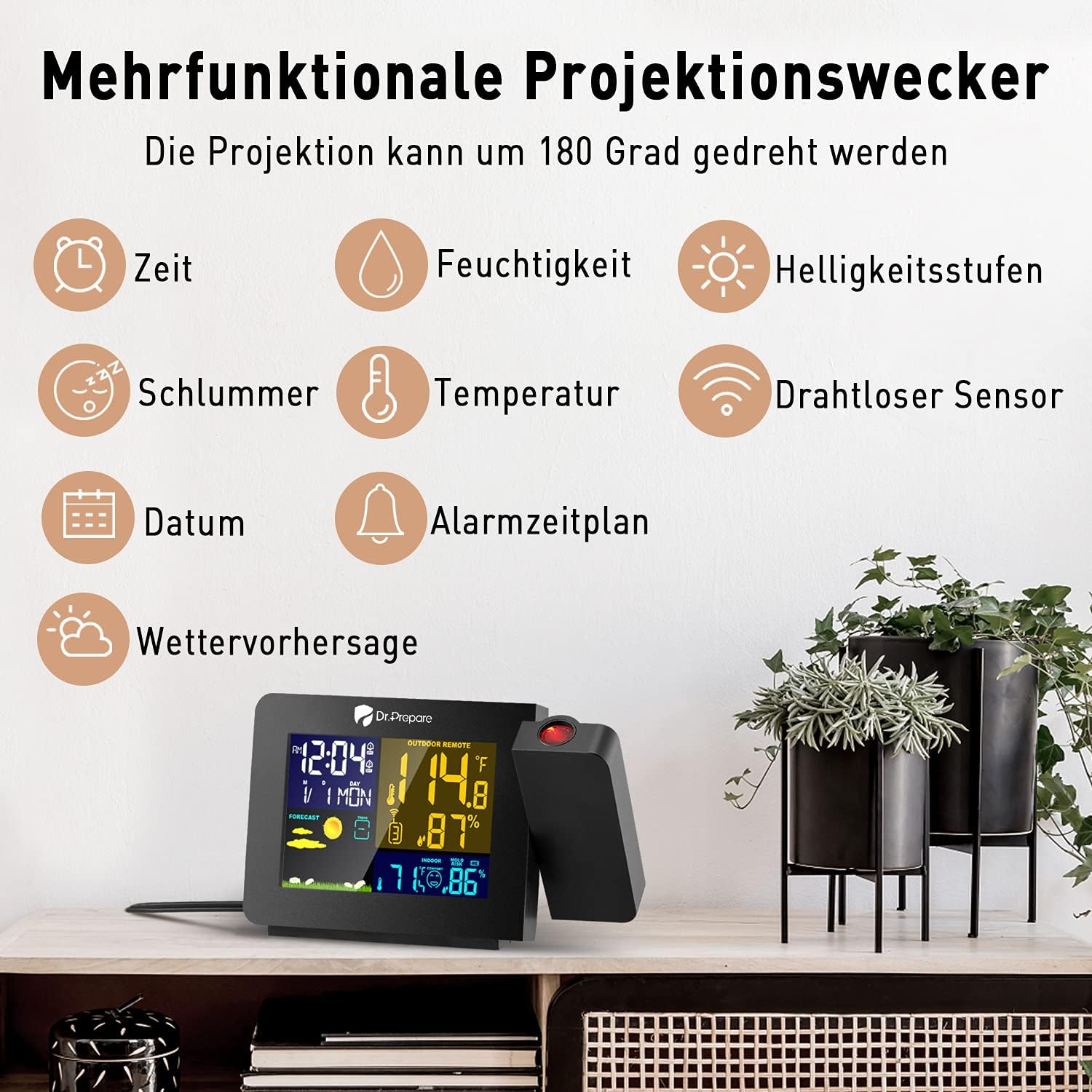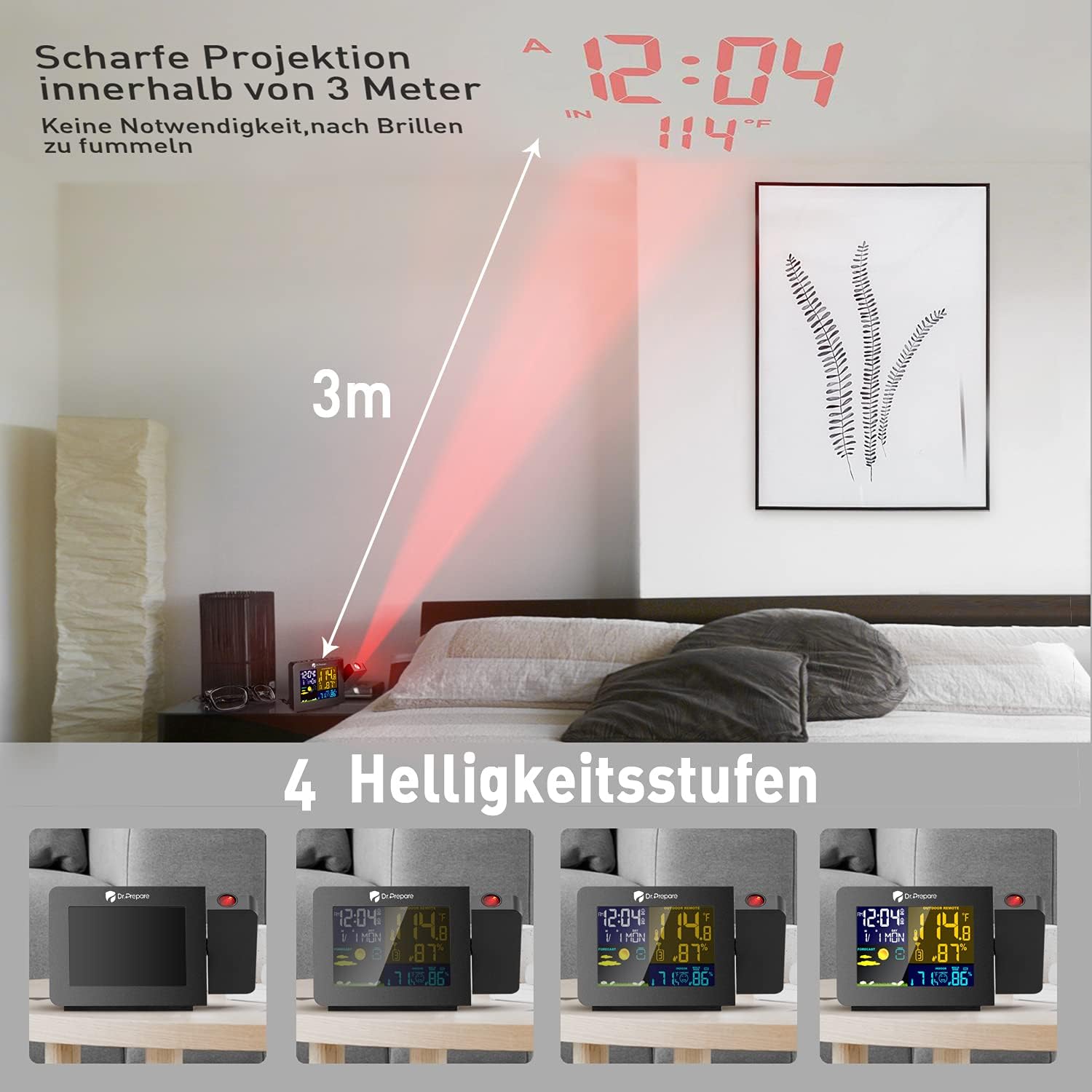 - 【Einstellbare Projektion】Die Zeit und Temperatur der Wetterstation werden an der Wand projiziert.Können Sie der Projektionshelligkeit ändern und kehren Sie die Projektion vor und zurück zwischen 180°um,um maximale Klarheit zu erzielen.In der dunklen Nacht können Sie die Uhrzeit sehen, ohne die Helligkeit des Alarmbildschirms anzupassen.