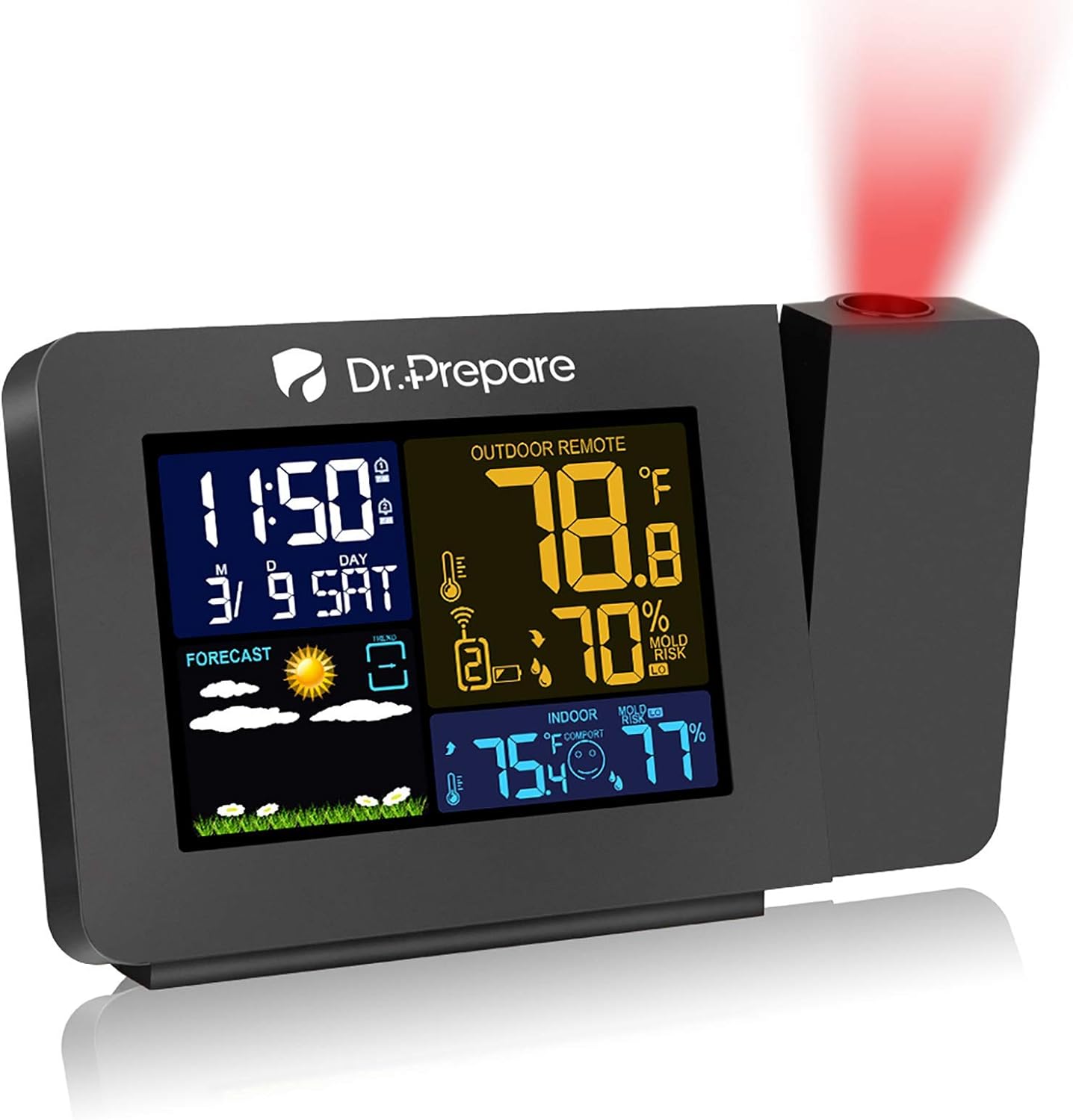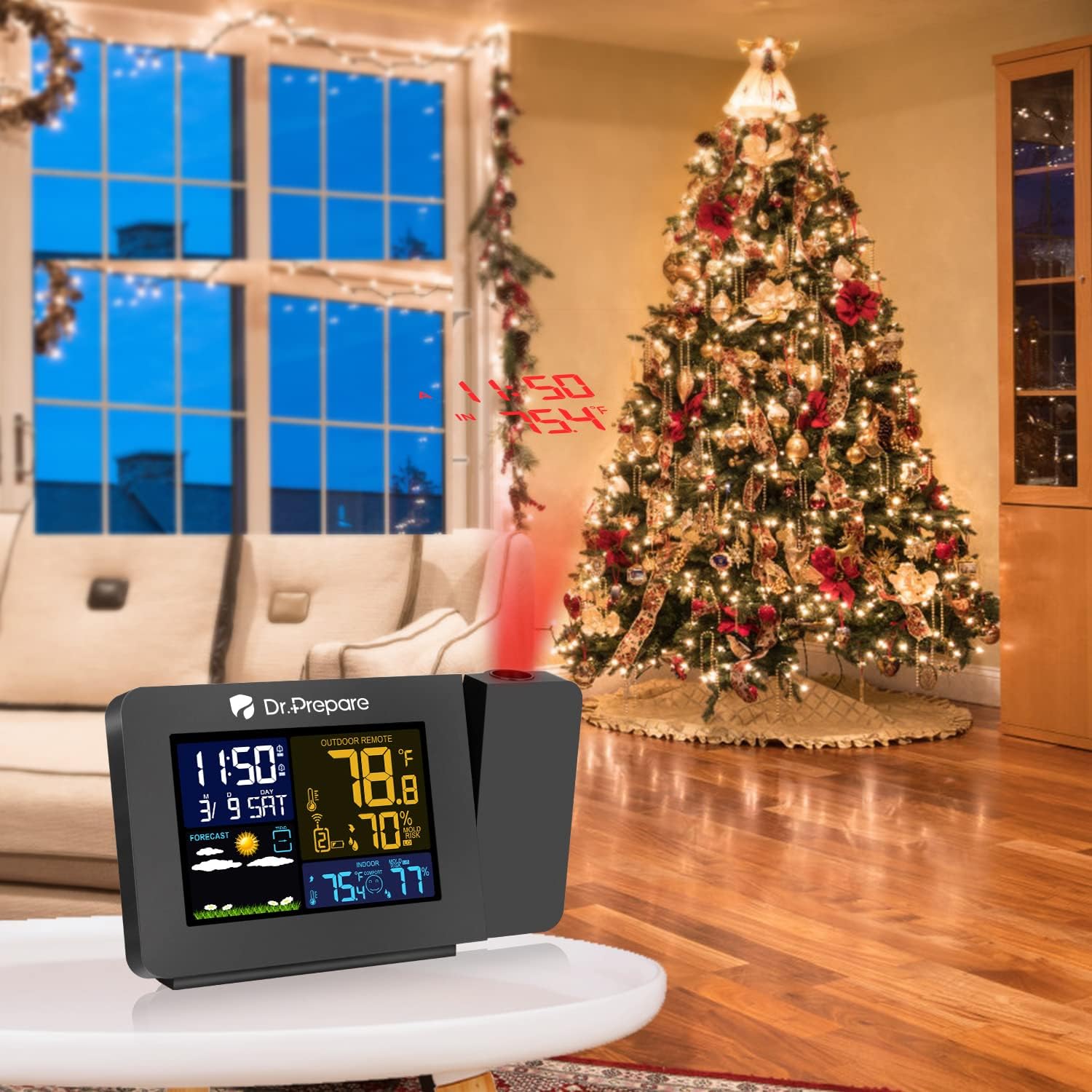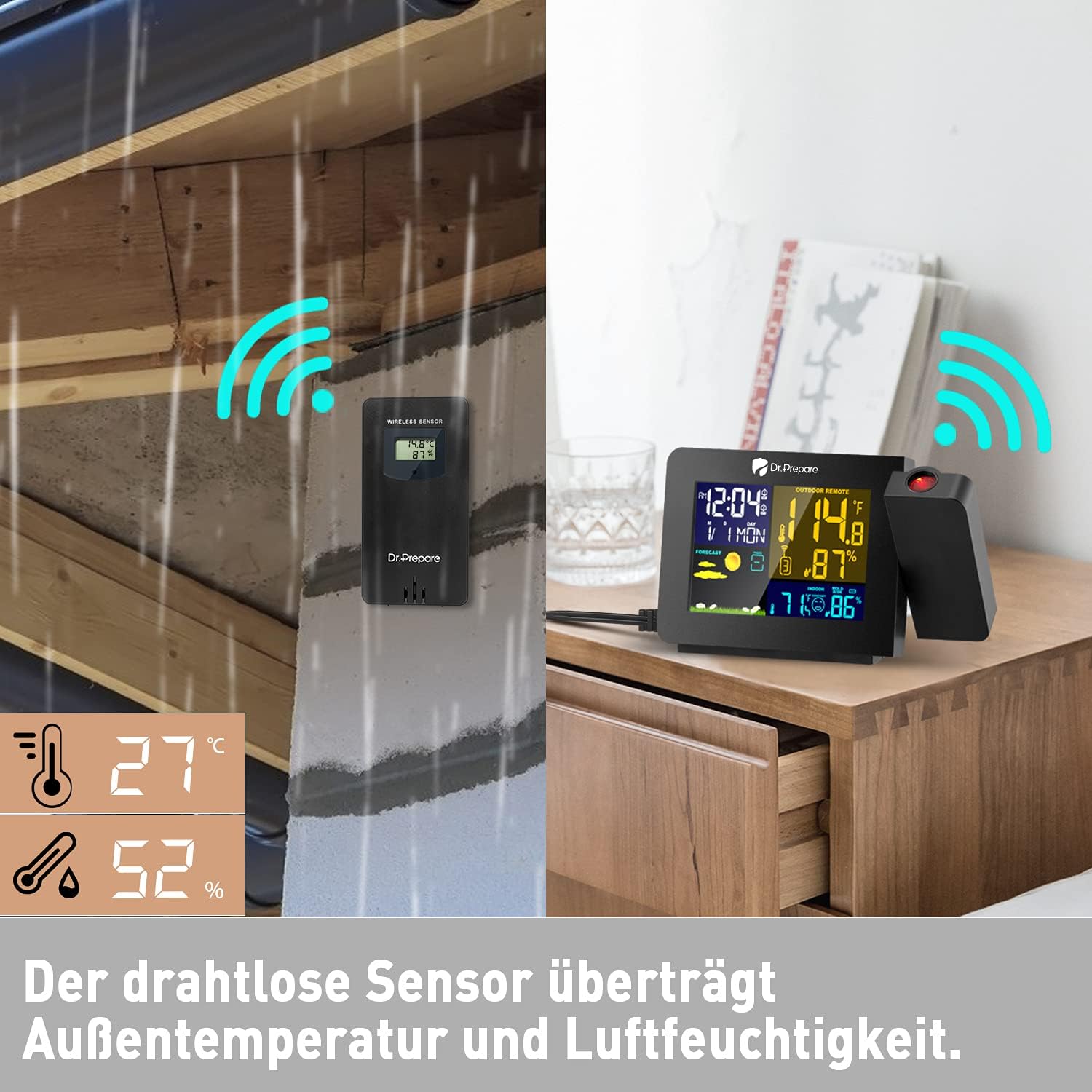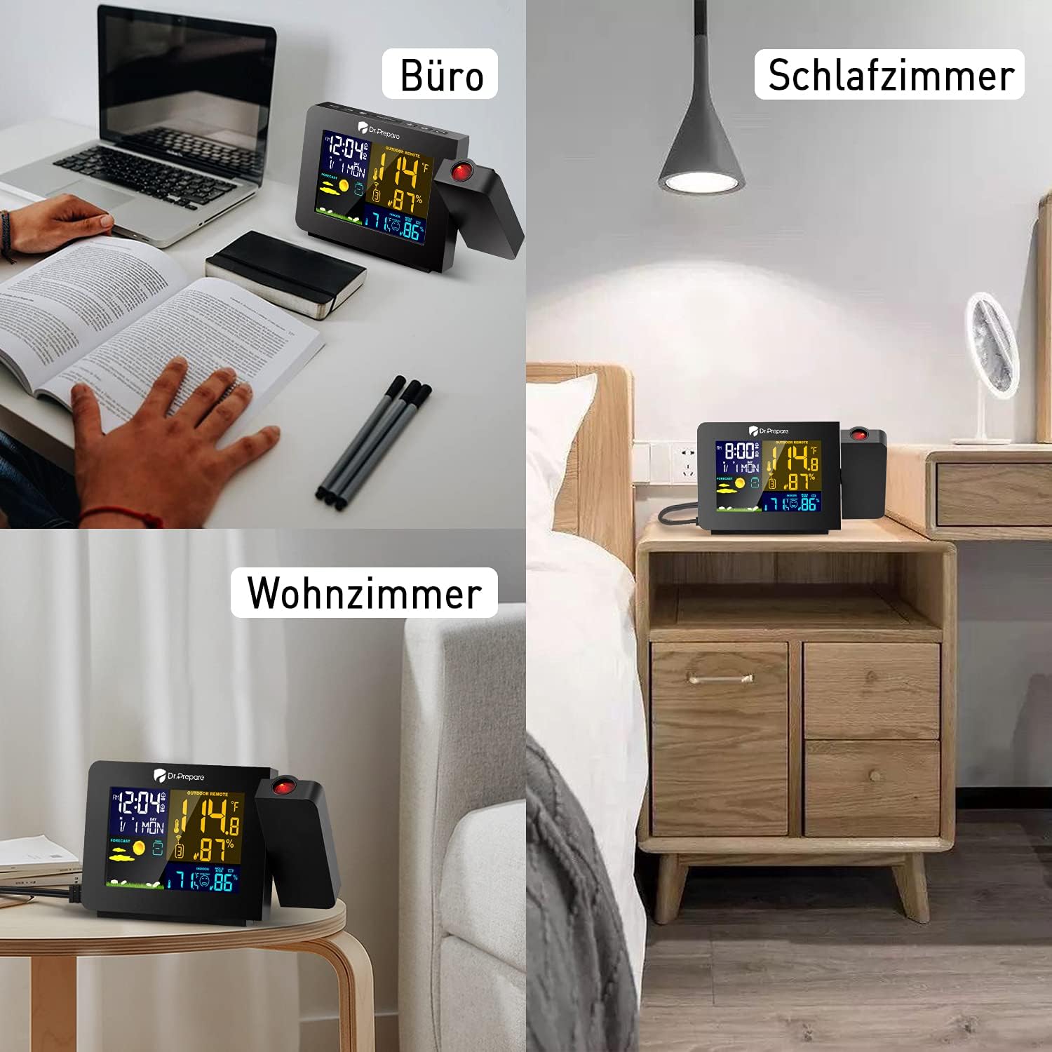 - 【Einstellbare Projektion】Die Zeit und Temperatur der Wetterstation werden an der Wand projiziert.Können Sie der Projektionshelligkeit ändern und kehren Sie die Projektion vor und zurück zwischen 180°um,um maximale Klarheit zu erzielen.In der dunklen Nacht können Sie die Uhrzeit sehen, ohne die Helligkeit des Alarmbildschirms anzupassen.