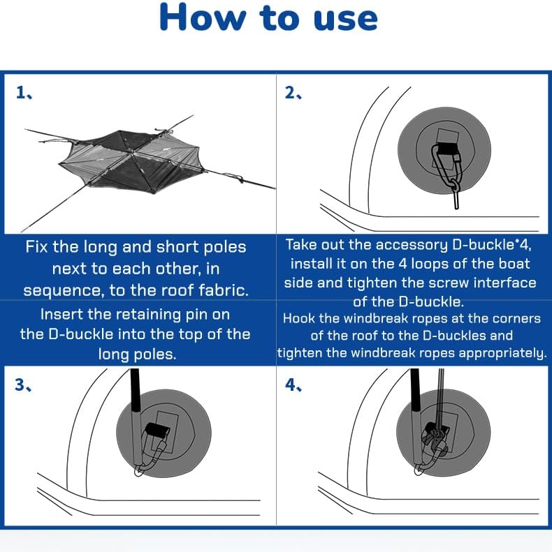 - ⛵ Vielseitig--es kann an einem Schlauchboot, als Sonnenschirm am Boot befestigt werden, oder Sie können einen genagelten Boden verwenden, um ein sehr stilvolles Fischerzelt und eine Markise zu bauen. Einfach aufzustellen, ohne zusätzliches Werkzeug, Zeit und Arbeit Speichern.