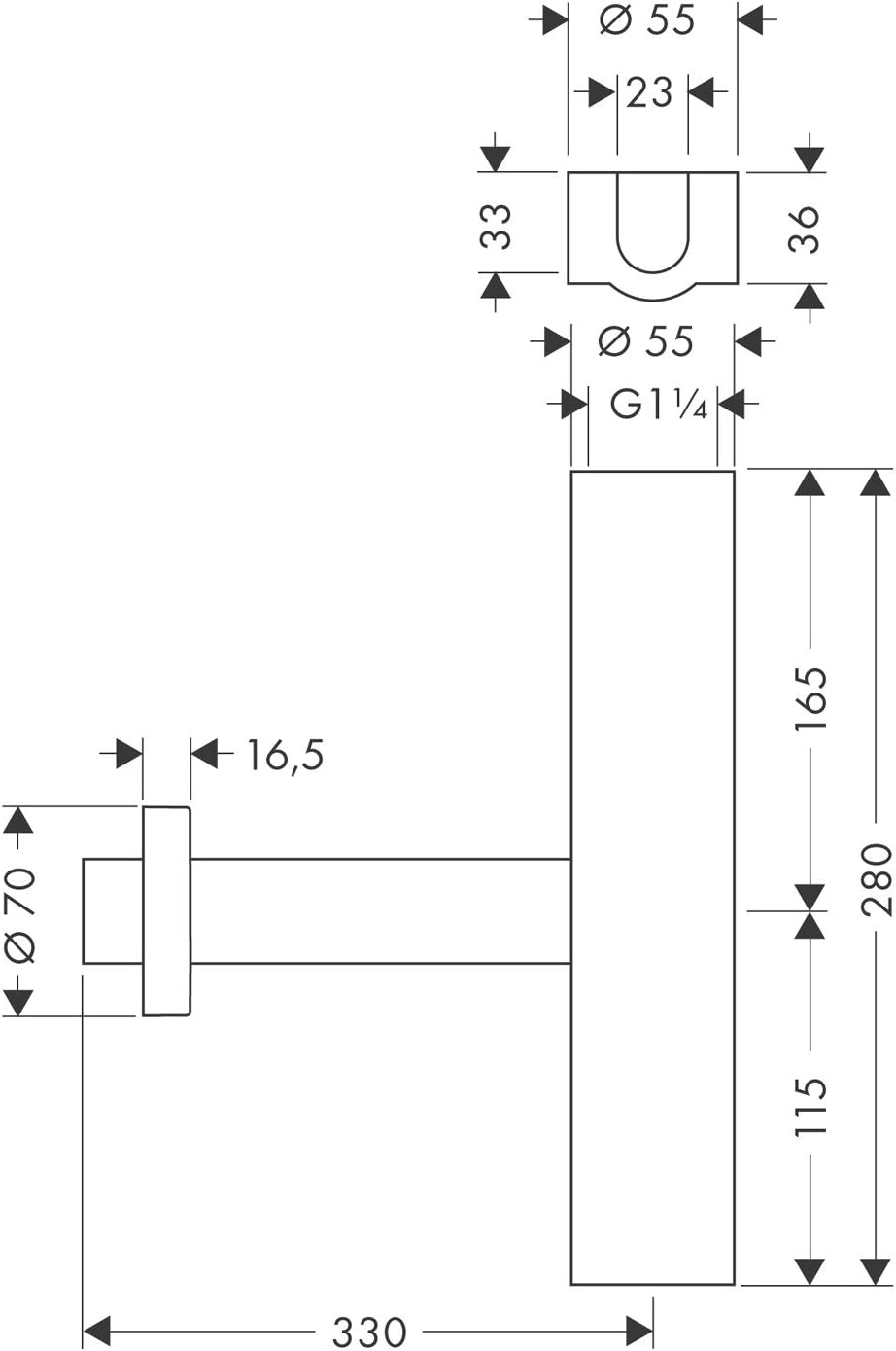 - Siphon bestehend aus: Tauchrohr 140 mm, Wandrohr, Rosette Ø 70 mm, Ventilblende