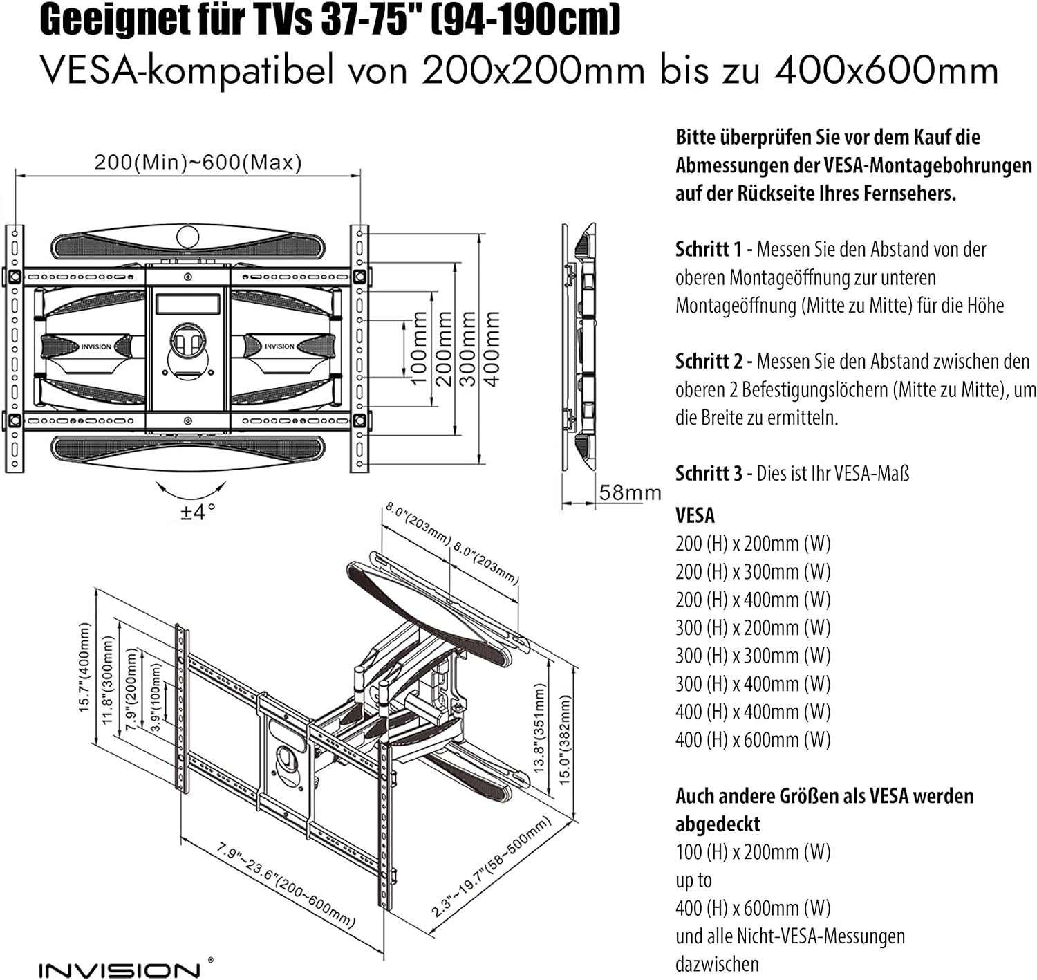 - 25 JAHRE GARANTIE - Wir sind stolz auf die Konstruktion und Haltbarkeit dieser Wandhalterung und gewährend 25 Jahre Garantie darauf. Preise inkl. MwSt. Die Invision Wandhalterung ist schnell und einfach zu installieren und enthält eine vollständige
