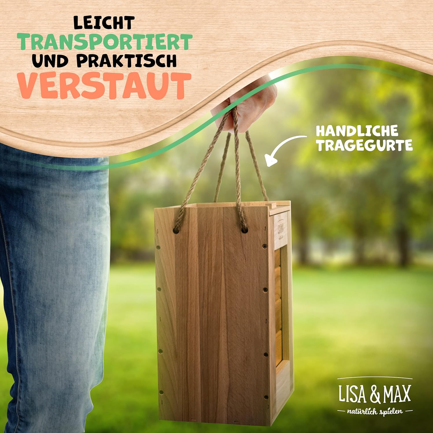 - ✅ KUBB TO GO - EASY MITZUNEHMEN: Wurfspiele sind geniale Spiele für draussen - laue Sommerabende im Garten, Park oder Urlaub schreien förmlich nach Kubb-Action; König,10 Bauern, 6 Wurf- & 4 Eckstäbe ab in die Holzkiste inkl. Tragseil aus Naturhanf