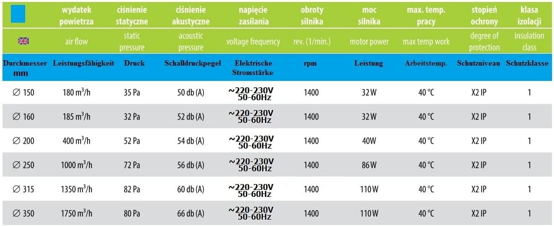 - Technische Daten: - Durchmesser: 150 mm ; Leistungsfähigkeit: 180 m3/h ; Druck: 35 Pa; Schalldruckpegel: 50 dB(A)