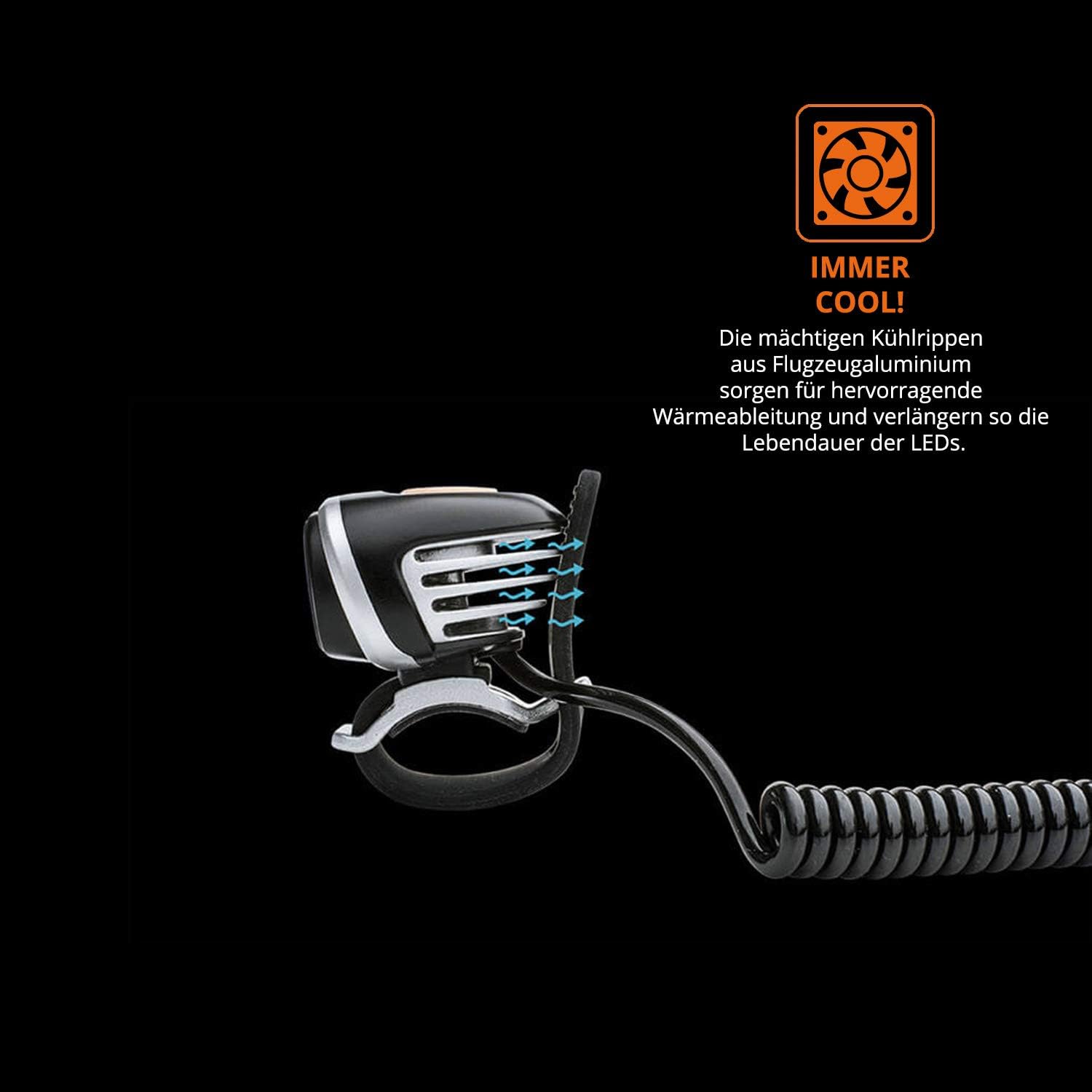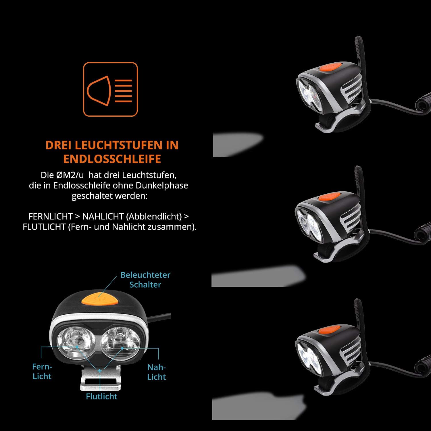 - ★ DURCHDACHTE BEDIENUNG: Mit dem orange illuminierten Klickschalter kannst du 3 Leuchtstufen anwählen: schaltbar ohne Dunkelphase. Beim Anschalten geht das Fernlicht an, mit einem weiteren Tastendruck das Nahlicht (Abblendlicht) und mit dem nächsten