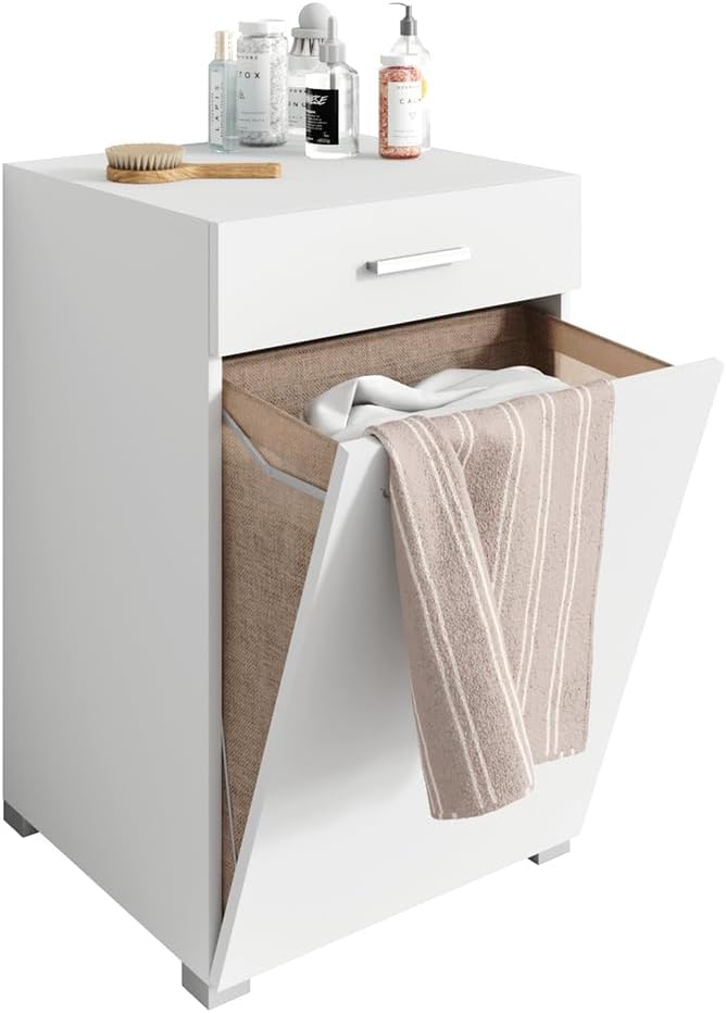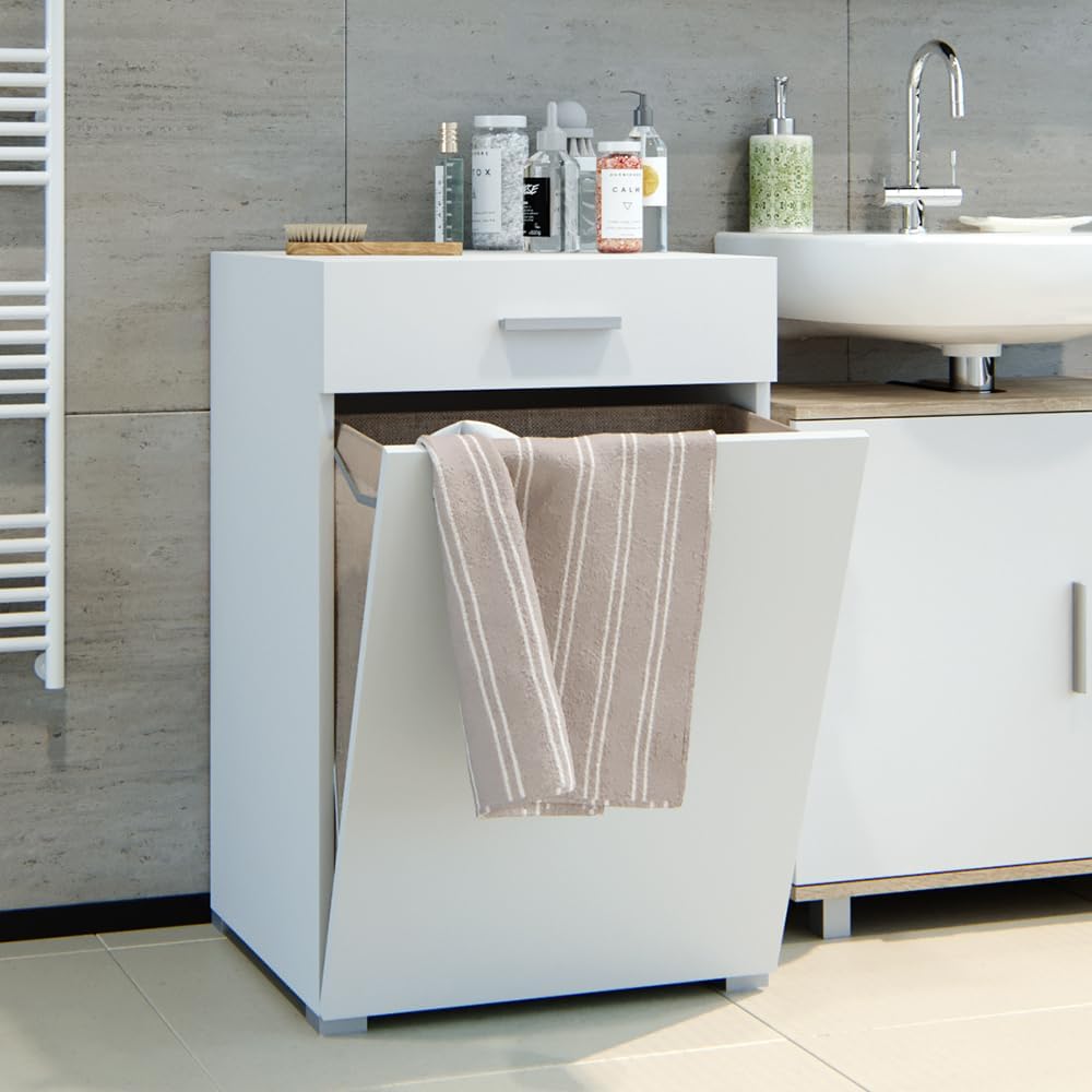 - Das Badmöbel bietet eine ausziehbare Schublade und einen faltbaren Wäschekorb für zusätzlichen Stauraum. Eine praktische Lösung für Ihr Badezimmer.