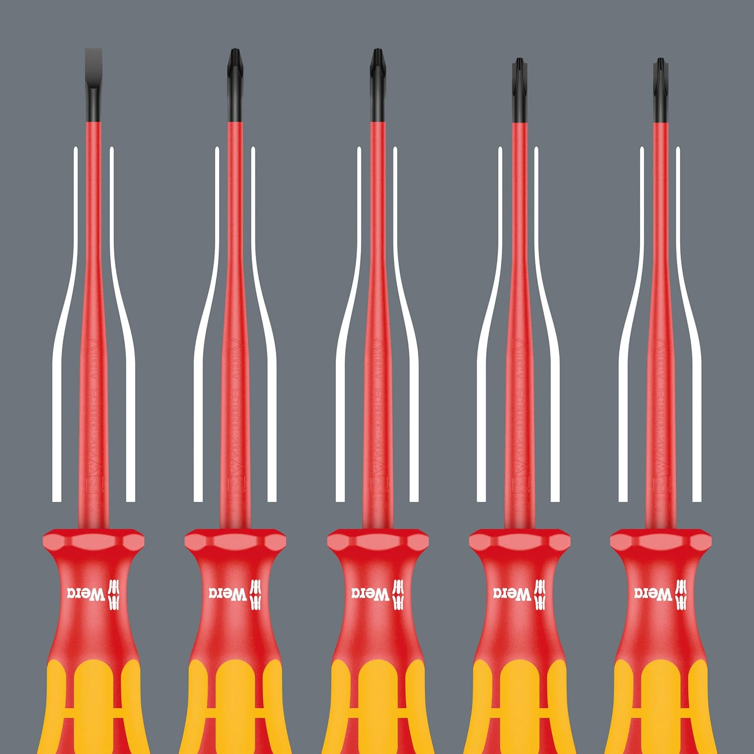 - Isolierte Werkzeuge, Klingen teilweise mit reduziertem Durchmesser für sicheres Arbeiten bis 1.000 Volt