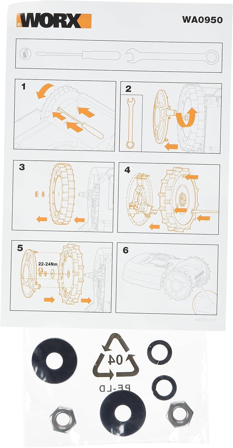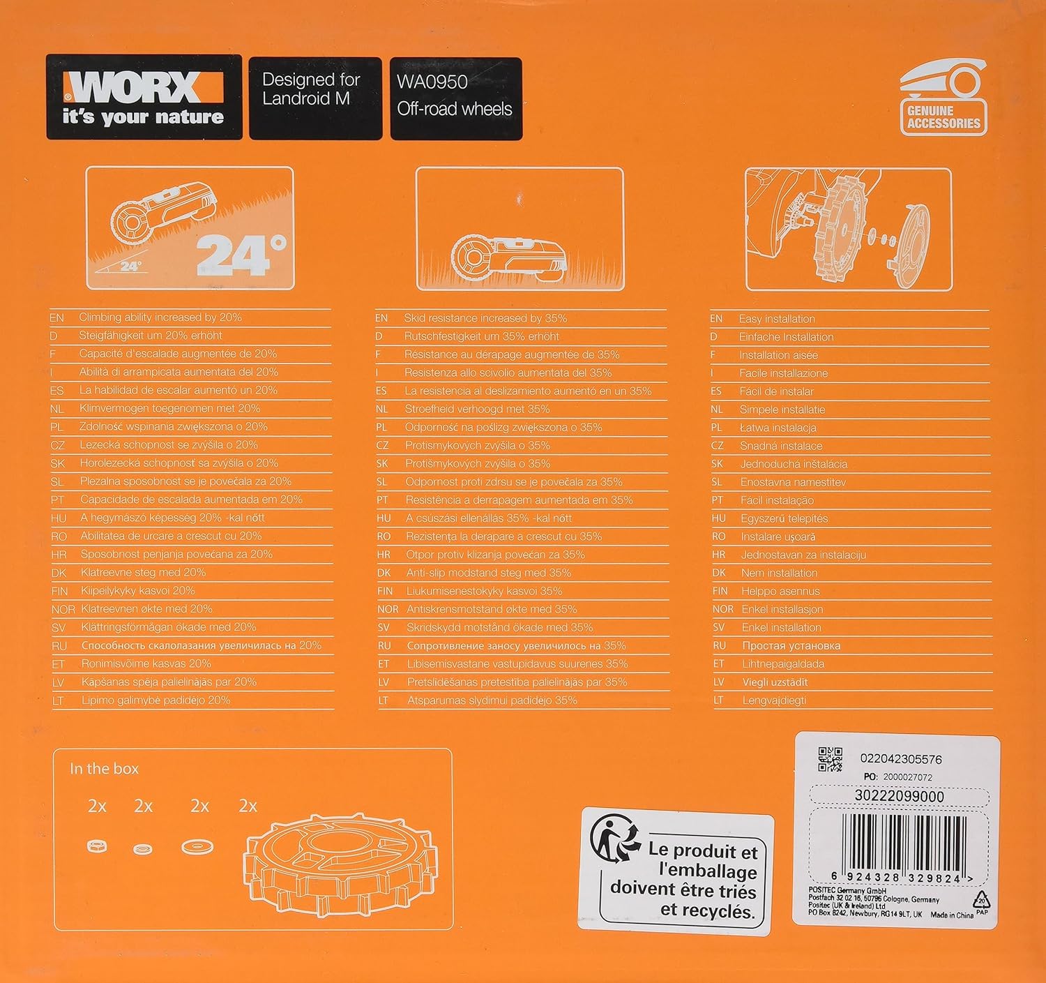 - Lieferumfang: WORX WA0950 Landroid Offroad-Räder (2 Räder) / Verbessern die Griffigkeit auf dem Rasen & schaffen Steigungen bis zu 24° bzw. 45 % / Für WR141E, WR142E & WR143E Mähroboter