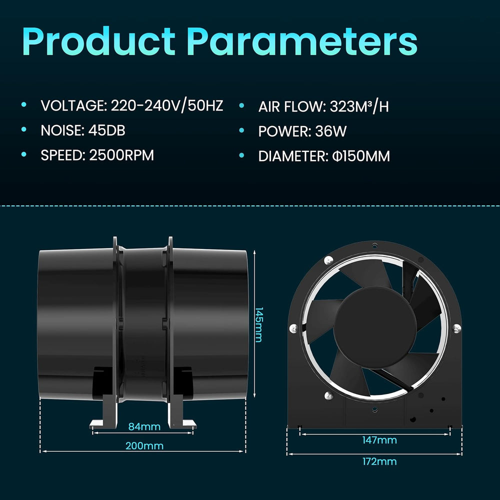 HG Power Abluftventilator 150mm Axial Rohrventilator Kanalventilator Metall Stark Inline-Lüfter Eins