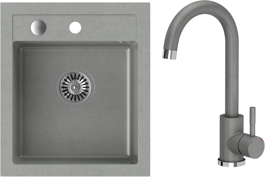 VBChome Spülbecken mit Armatur Grau 43 x 50 cm Granit Einzelbecken Einbauspüle gesprenkelt Verbundsp