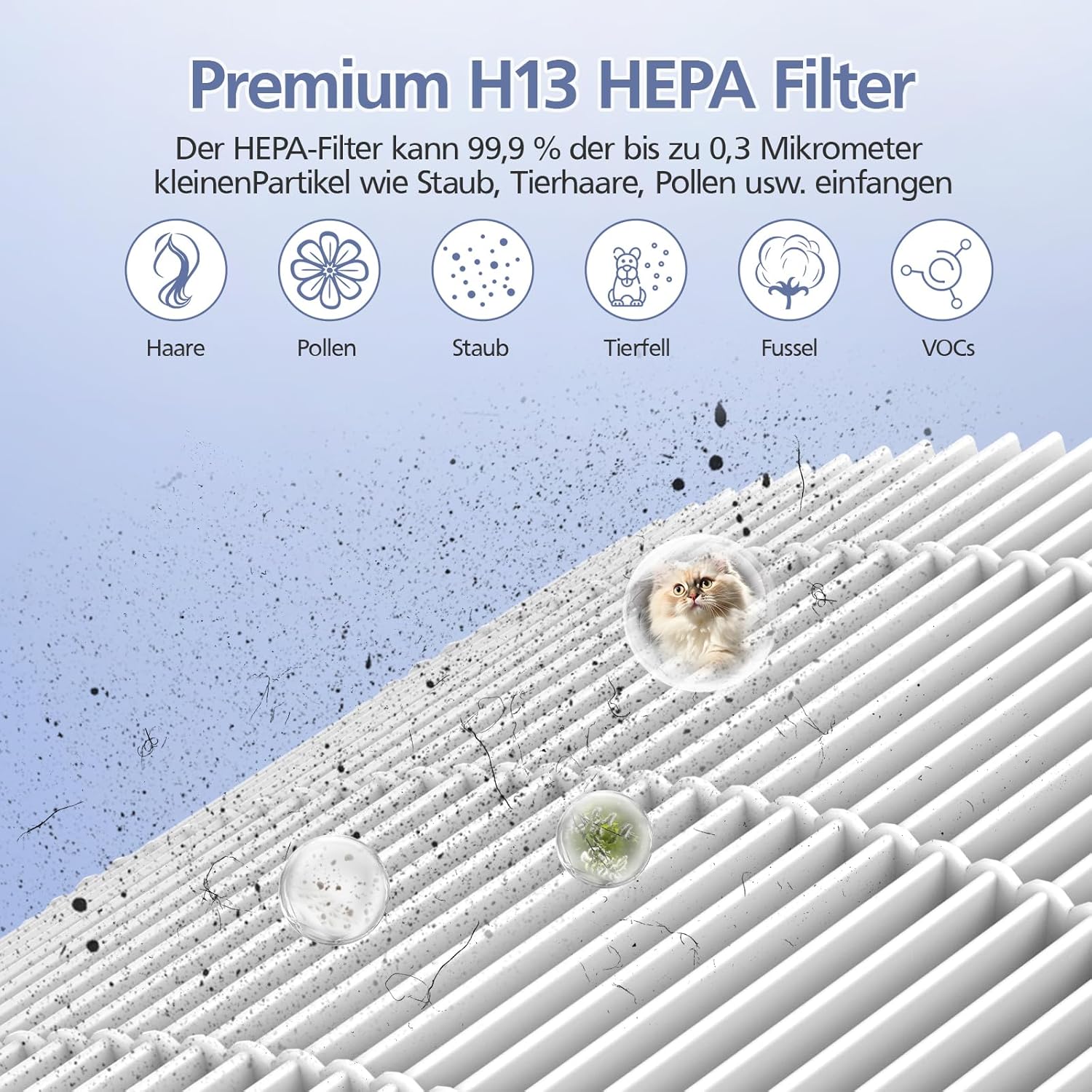 - H13 True HEPA-Filter: Der Ersatzfilter FY4440/30 verwendet einen True HEPA-Filter nach H13-Standard und entfernt 99,9 % der 0,3 Mikrometer grossen Partikel wie Tierhaare, Pollen, Flusen usw. So sorgt er effektiv für frische und gereinigte Luft für Sie