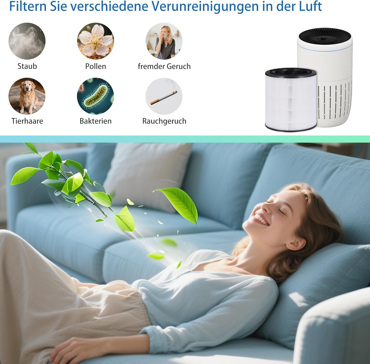 - Mehrere Filterschichten: Der austauschbare Filter entfernt Verunreinigungen mit einer Rate von bis zu 99 %, unabhängig davon, ob es sich um Hautschuppen, Tierhaare, Staub, Pollen und kleine Partikel oder Haushaltsgerüche usw. handelt.