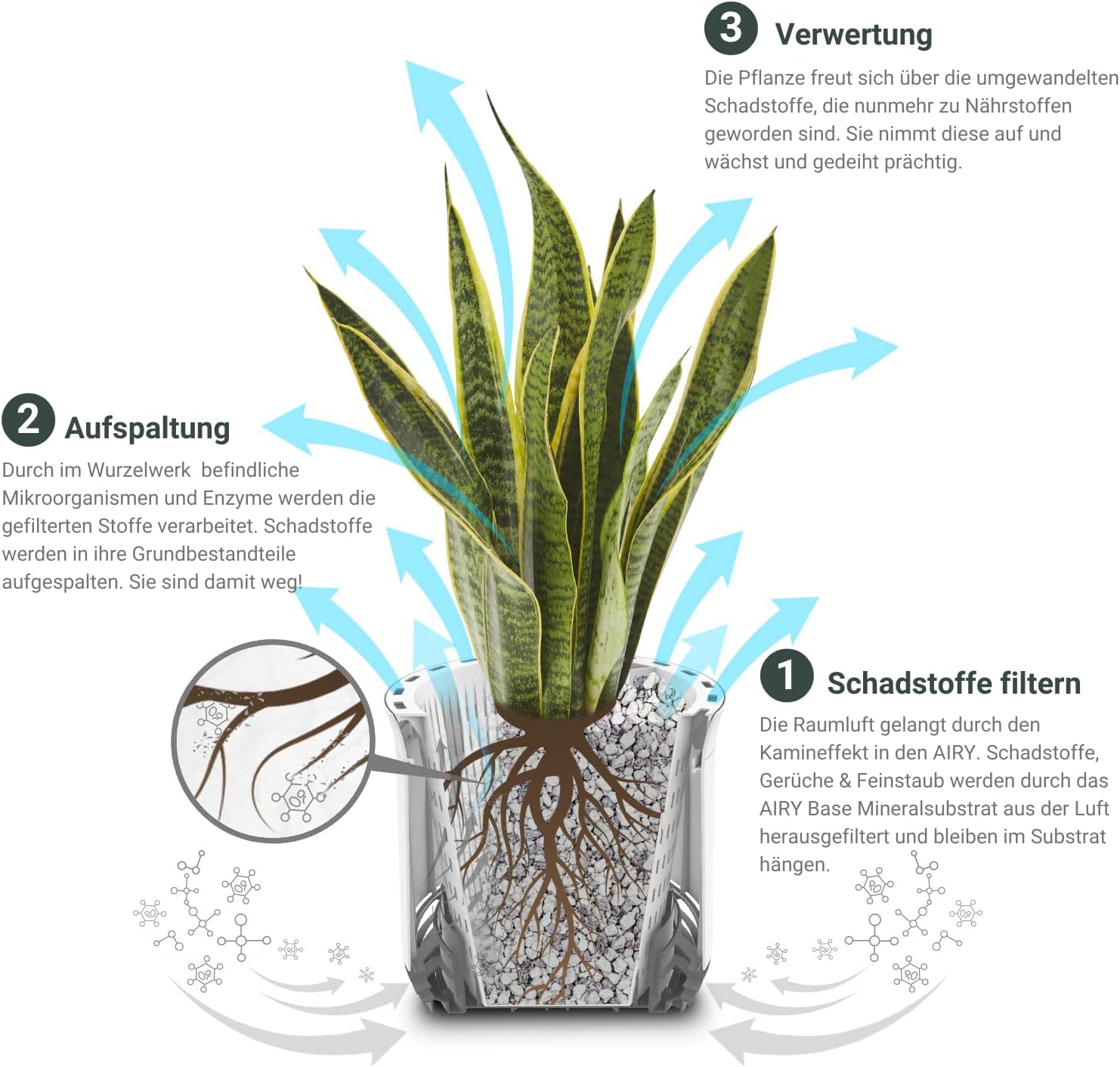 - 🌿 WISSENSCHAFT: Die NASA hat herausgefunden das die Raumluft hauptsächlich durch die Wurzeln gereinigt wird und nicht durch die Blätter. Die patentierte Bauform des AIRY Pots erzeugt einen Kamineffekt bei dem die belastete Luft kontinuierlich über