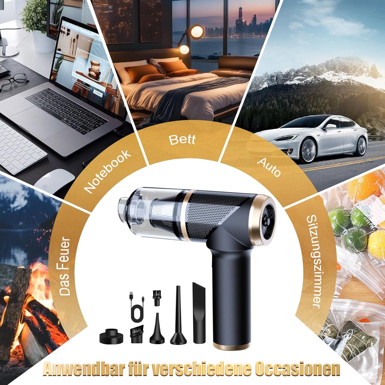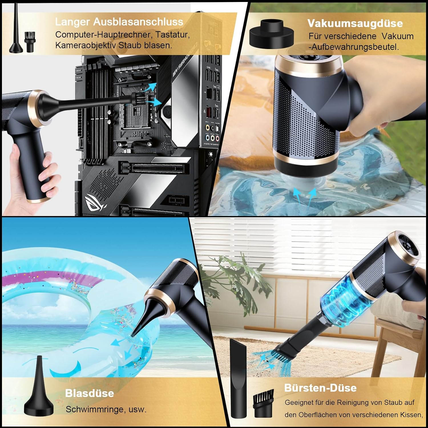 - 【3-in-1-Multifunktion】Dieser tragbare Staubsauger verfügt über verschiedene Düsen, die zwischen 3 Modi wechseln können: Saugmodus, Staubbläsermodus, Vakuumversiegelungsmodus. Er kann nicht nur grosse Staubflächen, sondern auch Spalten reinigen