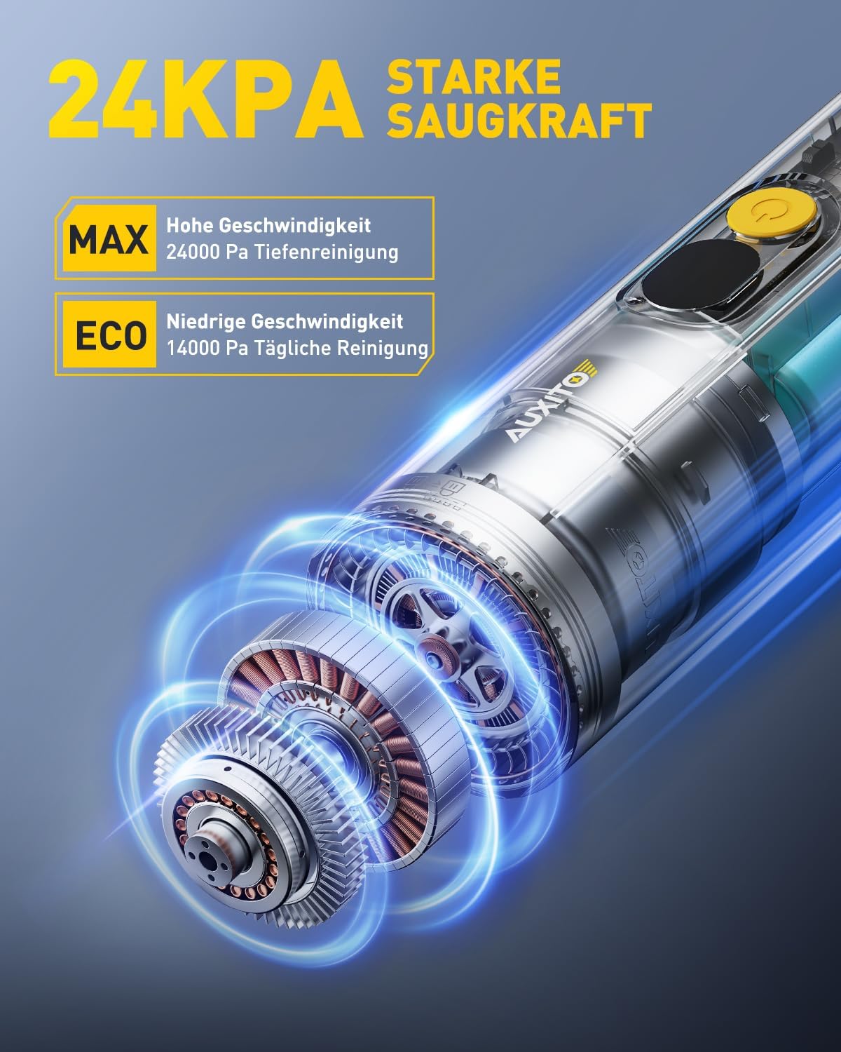 - 【Leistungsstarker 24000-Pa-Handstaubsauger】Dieser Handstaubsauger Akku verfügt über einen verbesserten, bürstenlosen Hochgeschwindigkeitsmotor für kraftvolle Reinigung. Dank zweier einstellbarer Saugstufen und sechs verschiedener Zubehörteile