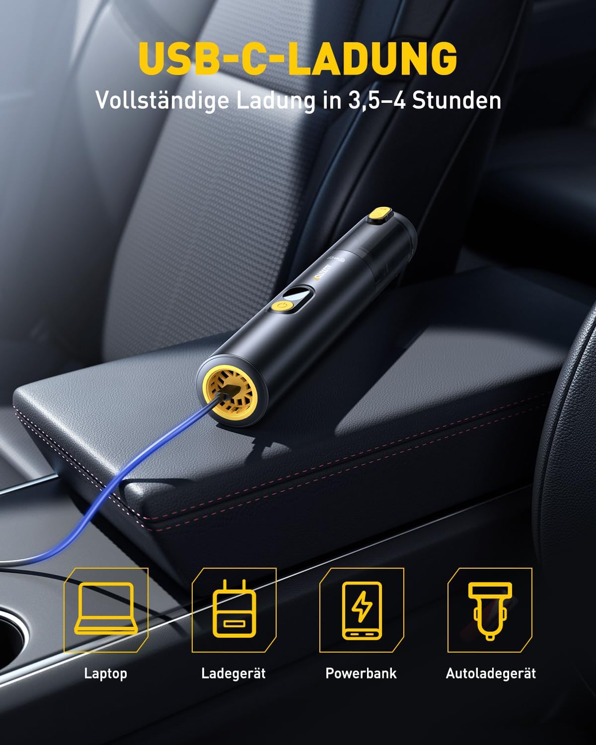 - 【Lange Laufzeit & Typ-C-Aufladen】Der Akku-Autostaubsauger kann bis zu 30 Minuten lang auf niedriger Geschwindigkeit laufen, und er kann in 3-4 Stunden vollständig aufgeladen werden. Es wird mit einem Ladekabel geliefert, das an einen Laptop, einen