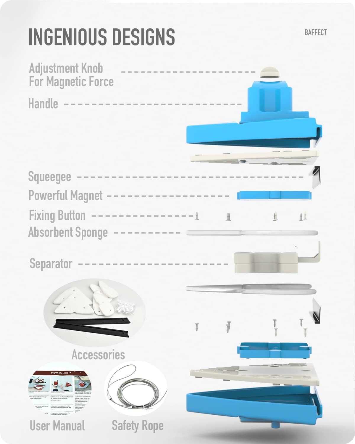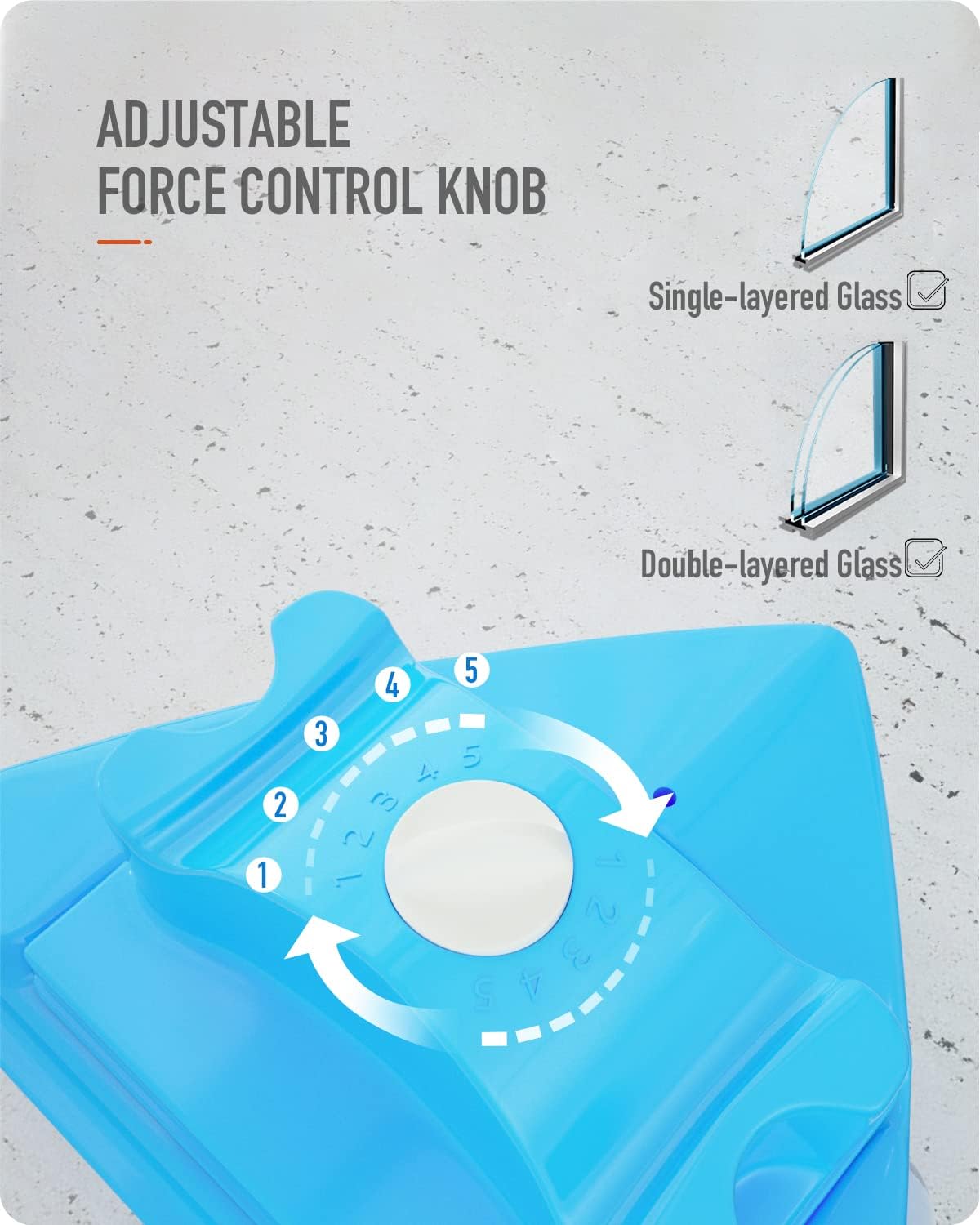 - 5 Arten Magnetismus, zum der unterschiedlichen Glasstärke zu entsprechen: Der magnetische Fensterputzer haben 5 Gänge des Magnetismus, er ist geeignet für Einfach-und Doppelverglasung mit einer Gesamtstärke von 4-30 mm und nicht für