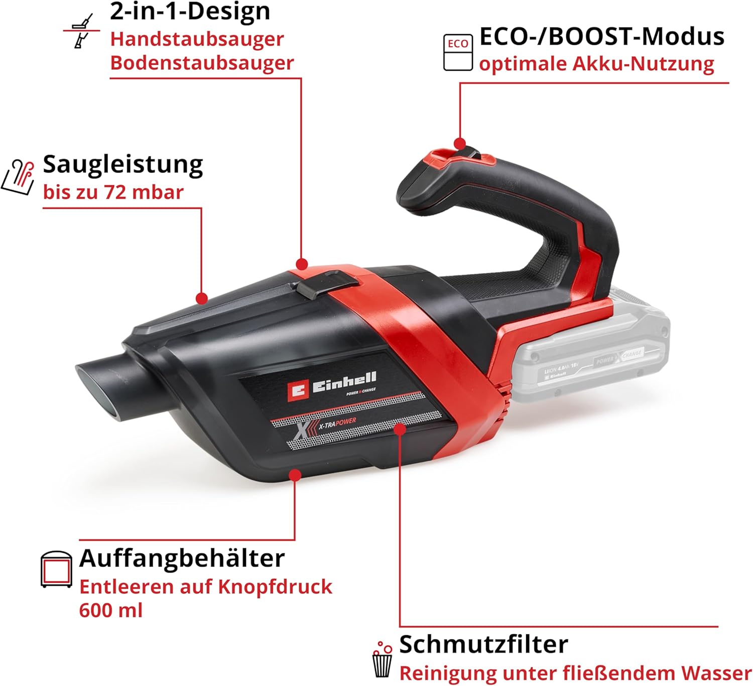 - Power X-Change – Der Einhell Akku-Handstaubsauger TE-HV 18/06 Li ist Teil der Einhell Power X-Change Familie, in der Akkus, Ladegeräte und Systemgeräte kombiniert werden können.