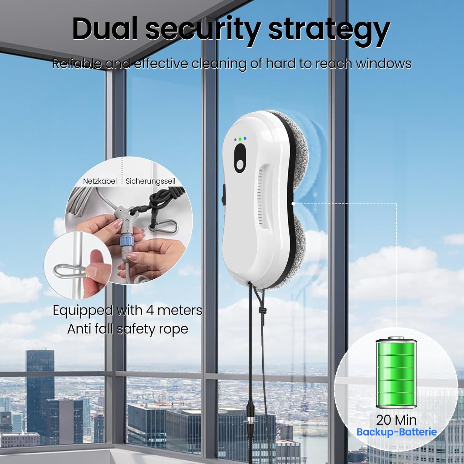 - 【Sicherheitssystem】: Der Fenstersauger Glasreinigungssroboter hat einen eingebauten Lithium-Ionen-Akku. Bei einem versehentlichen Stromausfall kann der Fensterreinigungsroboter das Glas 20-30 Minuten lang hart saugen und einen Alarm auslösen. Der