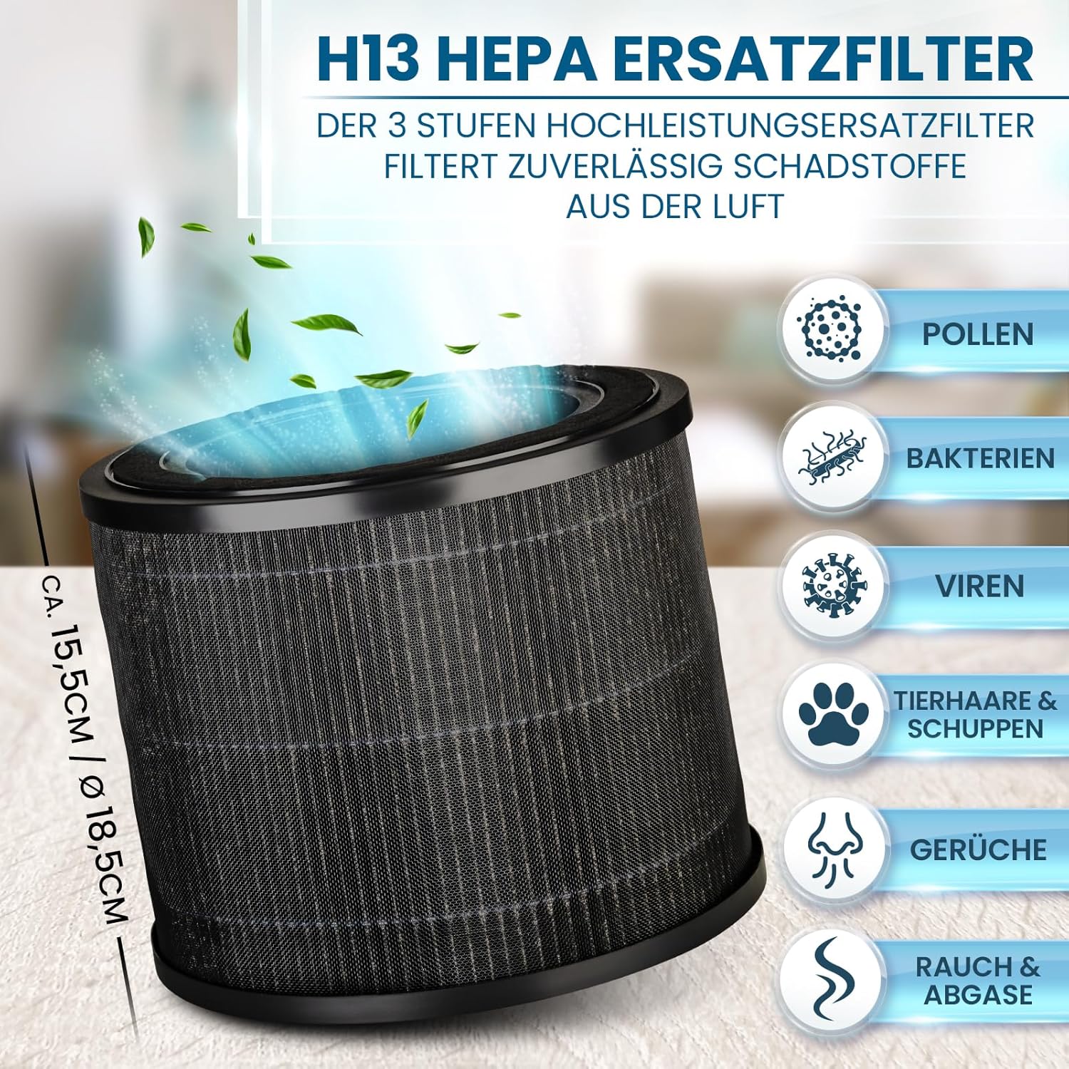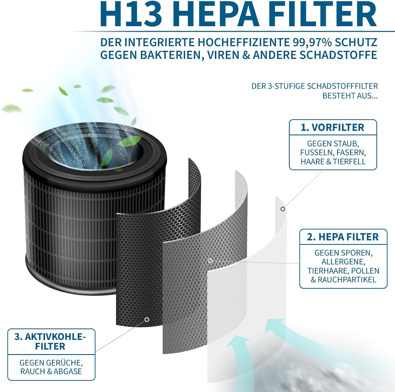 - ✅ PREMIUM FILTER: Der 3stufige Schadstoff Filter besteht aus einem Vorfilter gegen Staub, Fusseln, Fasern, Haaren und Tierfell, einem HEPA Filter gegen Sporen, Allergene, Tierhaare, Pollen und Rauchpartikel und einem Aktivkohle Element gegen Gerüche,
