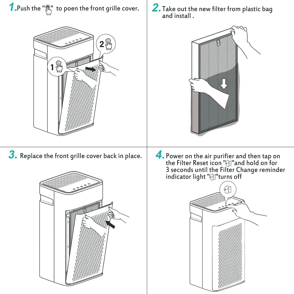- ✅ Einfach auszutauschen: Schalten Sie das Gerät aus, öffnen Sie das Frontgitter, entfernen Sie den alten Filter und setzen Sie den neuen Ersatzfilter ein. Nach der Installation drücken und halten Sie die FILTER RESET-Taste für 3 Sekunden, um den