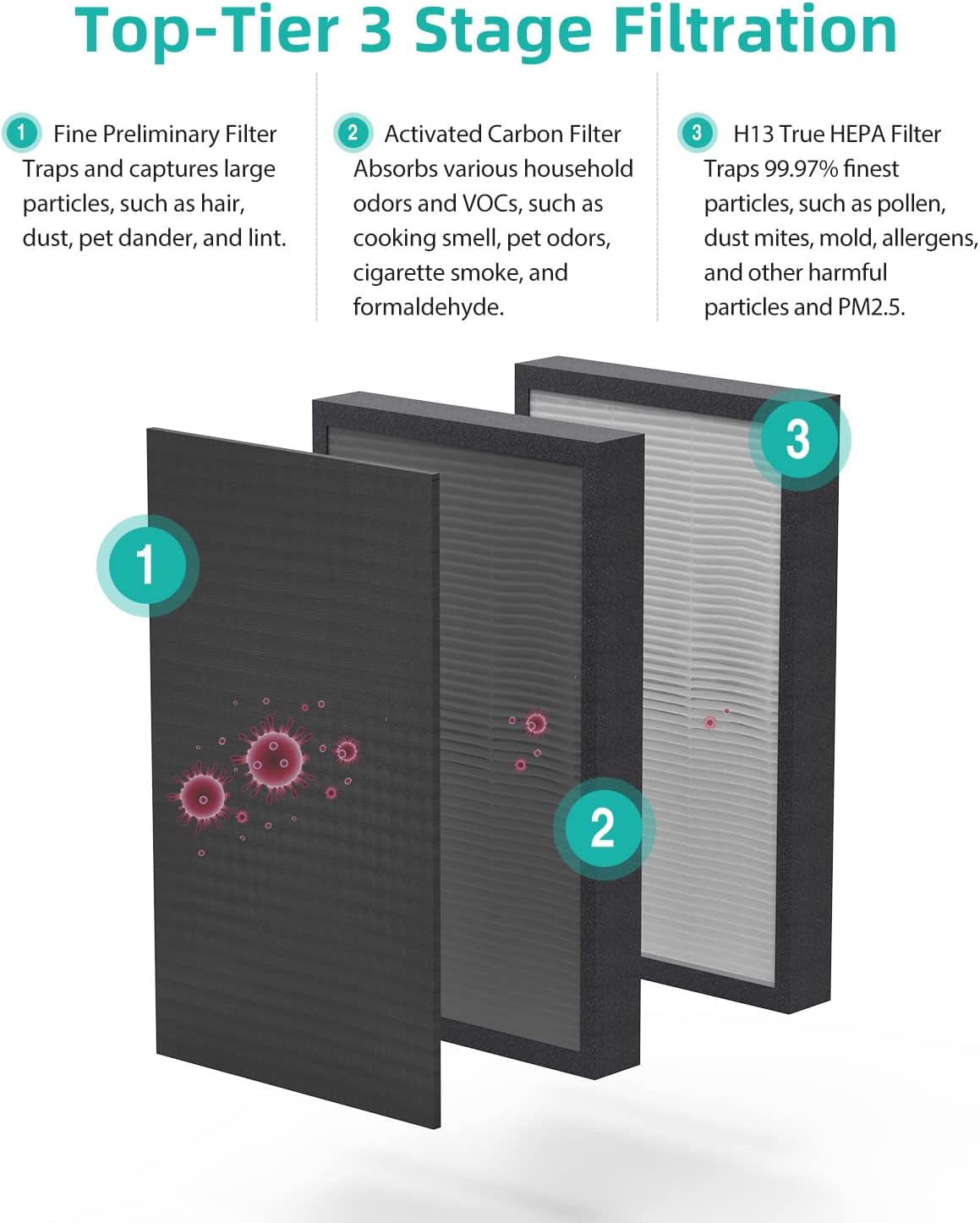 - ✅ H13 True HPEA Filter: Der effektivste Filter, der 99,97 % der Partikel wie Staub, Tierhaare, Schimmel, Sporen, Pollen und Hausstaubmilben entfernt. Diese Premium-Filter filtern auch Luftschadstoffe wie PM10 und PM2,5 heraus, um die Luftqualität in