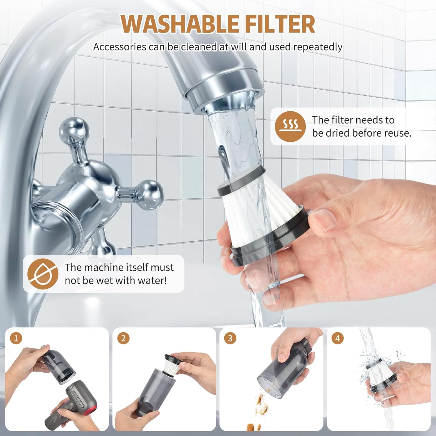 - 🎁【Ergonomisches Design und waschbarer Filter】- Der kabellose Handstaubsauger hat ein ergonomisches, strukturiertes Griffdesign, das einen bequemen Griff bietet. Einfach zu montieren und abnehmbar. Der HEPA-Filter ist waschbar, aber nach dem