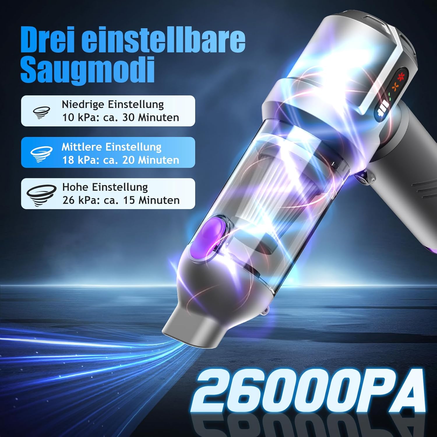 - 【Leistungsstarker Handstaubsauger mit 26000 Pa】Dieser Handstaubsauger ist mit einem verbesserten bürstenlosen Hochgeschwindigkeitsmotor ausgestattet. Er verfügt über drei einstellbare Saugmodi: 10000 Pa, 18000 Pa und 26000 Pa, die eine