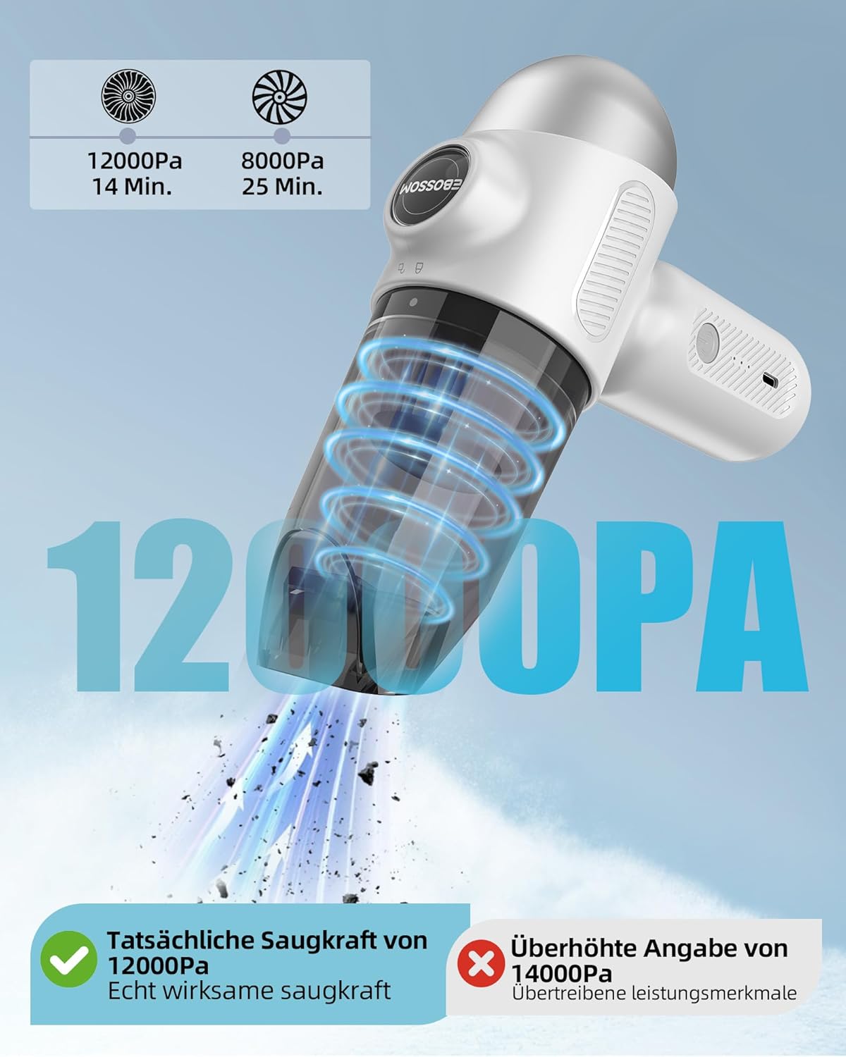 - 【Starkes Saugvermögen von 12000PA】 Mit einer Saugkraft von 12000PA ist der EBOSSOM V6 Ultra in der Lage, schnell und gründlich Staub, Schmutz und Tierhaare zu entfernen. Er erreicht auch die verstecktesten Ecken und Winkel, um eine vollständige