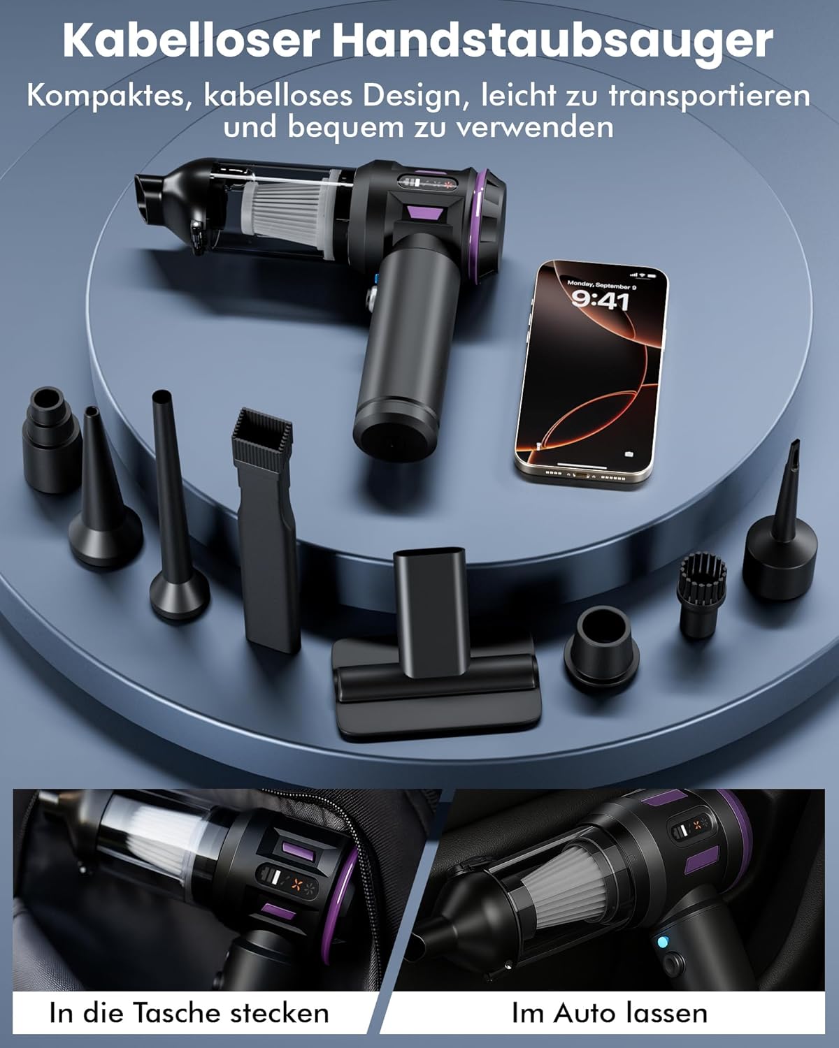 - 【Müheloses Reinigen mit bürstenlosem Motor】Dieser kabellose Autostaubsauger wurde für Ihren Komfort entwickelt – sein ultrakompaktes, leichtes und wiederaufladbares Design ermöglicht müheloses Tragen, Aufbewahren und Verwenden, wo immer Sie