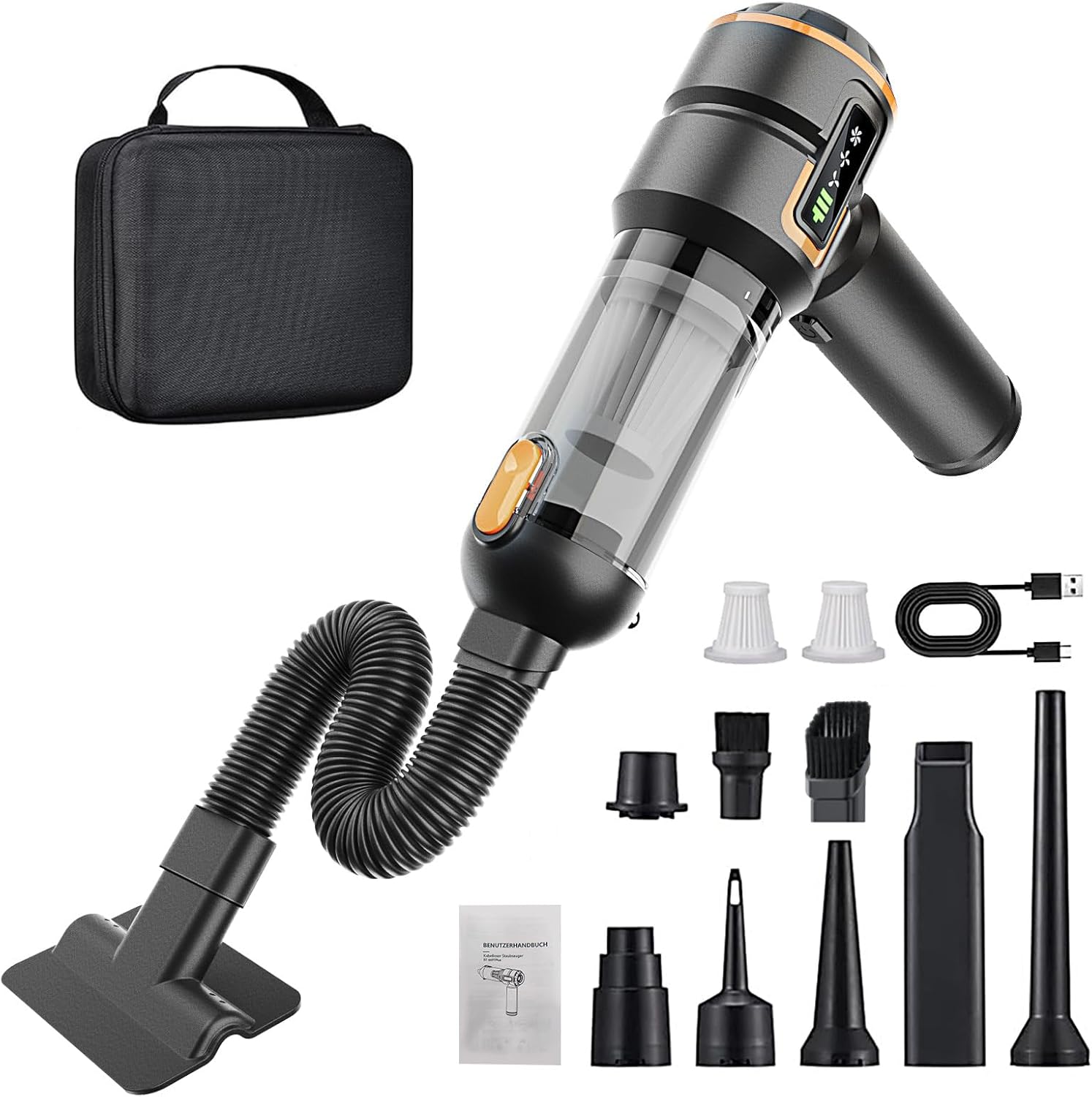 - 【PORTABLE Cordless Design】Kabelloser autostaubsauger ist mit 6000mAh lithium-akku ausgestattet, der kontinuierlich für 15-30minuten arbeiten kann (je nach Modus, den Sie verwenden).Typ-C schnellladeanschluss kann in 3 stunden vollständig aufgeladen