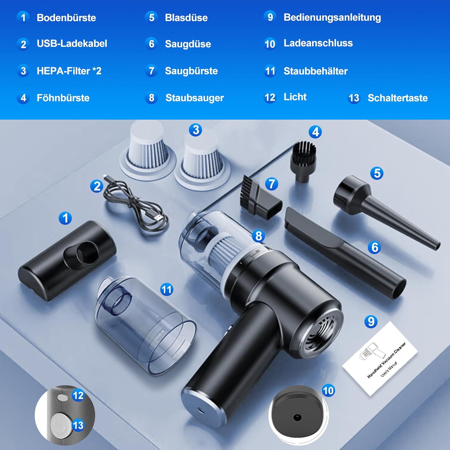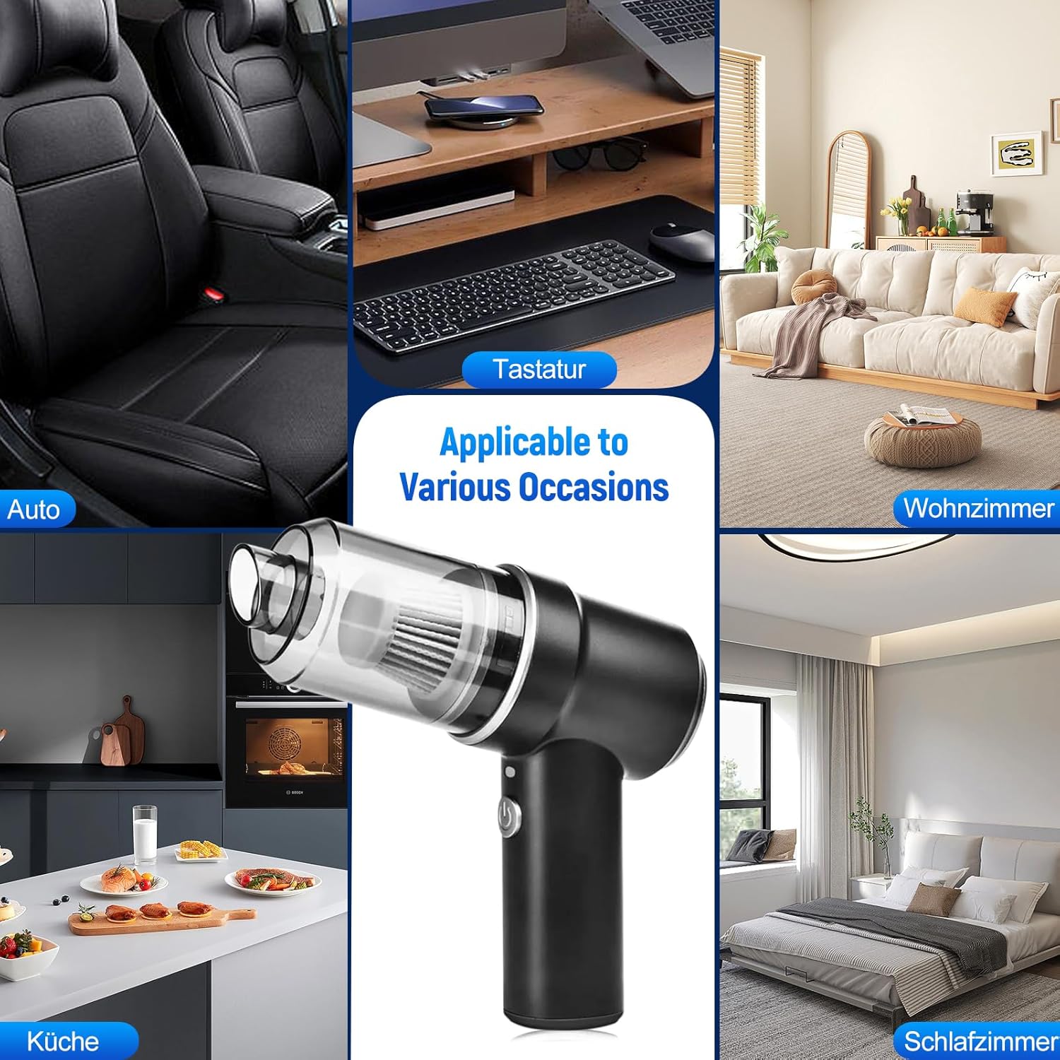 - Multifunktionaler Staubsauger: Der 2-in-1-Handstaubsauger saugt und bläst. Eine Seite des Staubsaugers bläst Staub weg, während die andere Seite ihn mit starker Saugkraft aufnimmt, wodurch eine effiziente Reinigung gewährleistet ist. Er ist der