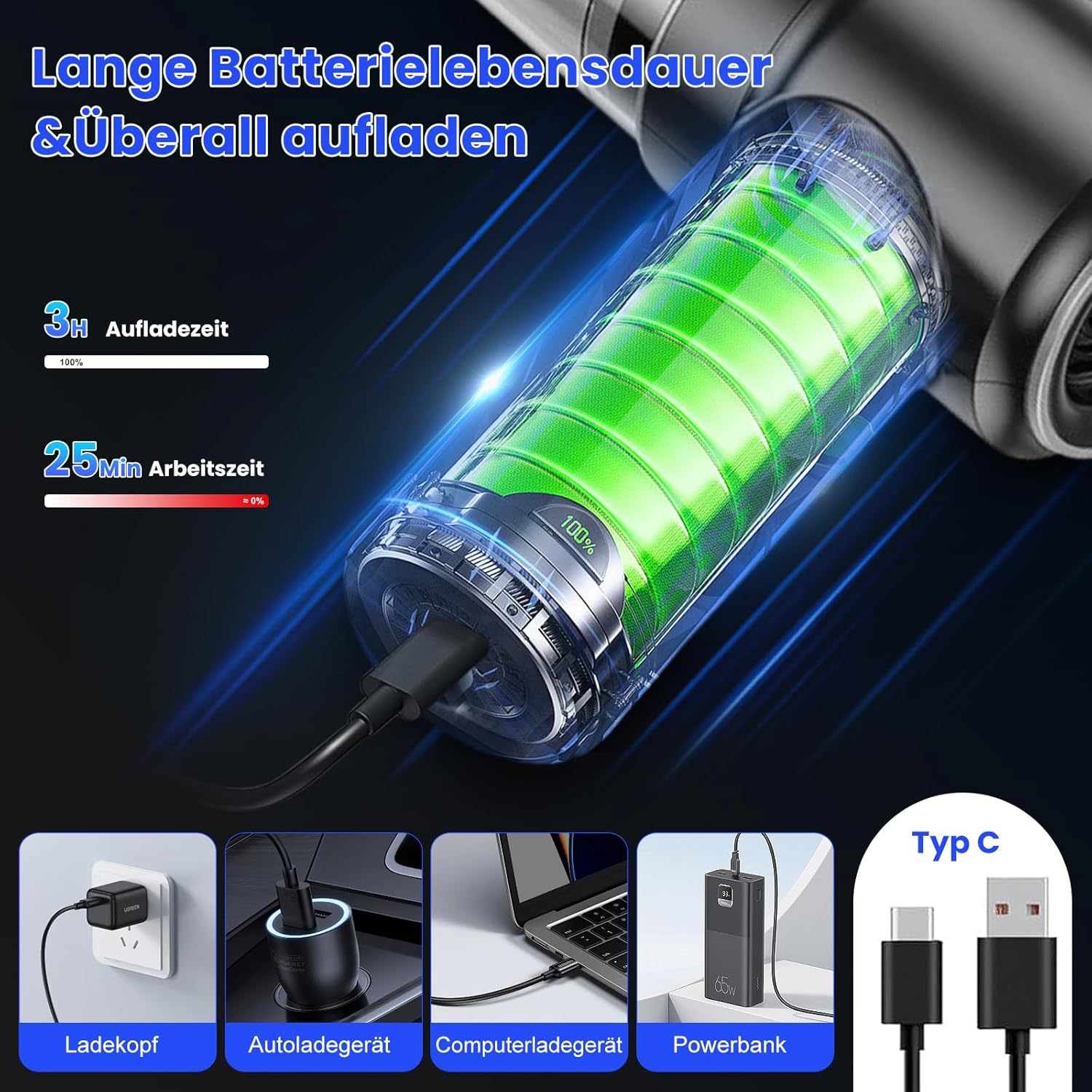 - Schnellladung und lange Laufzeit: Der kabellose Staubsauger verfügt über eine Schnellladefunktion. Der tragbare Staubsauger wird mit einem 4.000-mAh-Akku und einem Typ-C-Ladekabel betrieben und kann an einen Laptop, den USB-Anschluss eines Autos oder