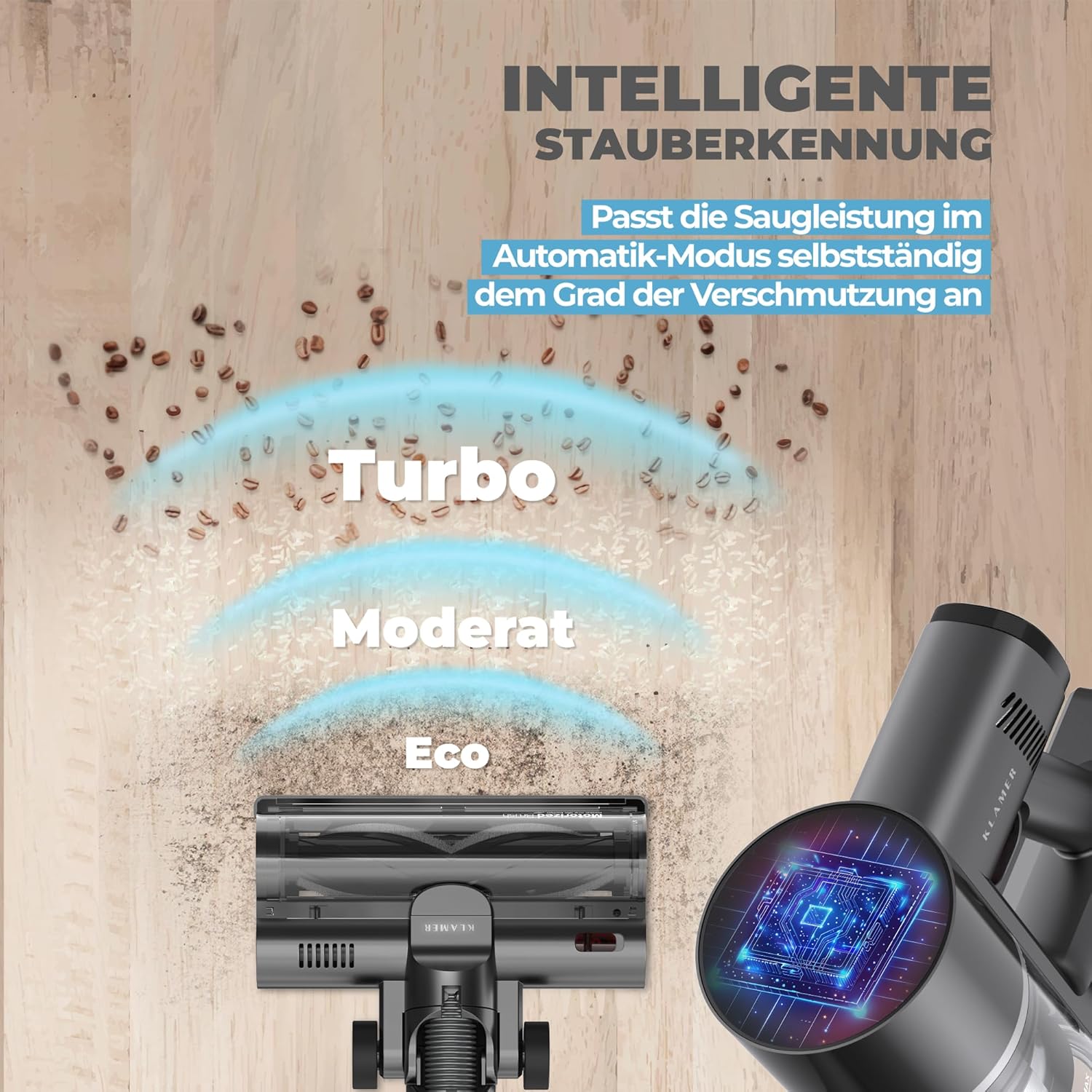 - LAUFZEIT: Der austauschbare Akku gewährleistet eine Saugleistung von bis zu 50 Minuten. Ausgerüstet mit einer LED-Bodenkopfbeleuchtung kann der Staubsauger in verwinkelten Ecken versteckte Krümel und Feinstaub beseitigen
