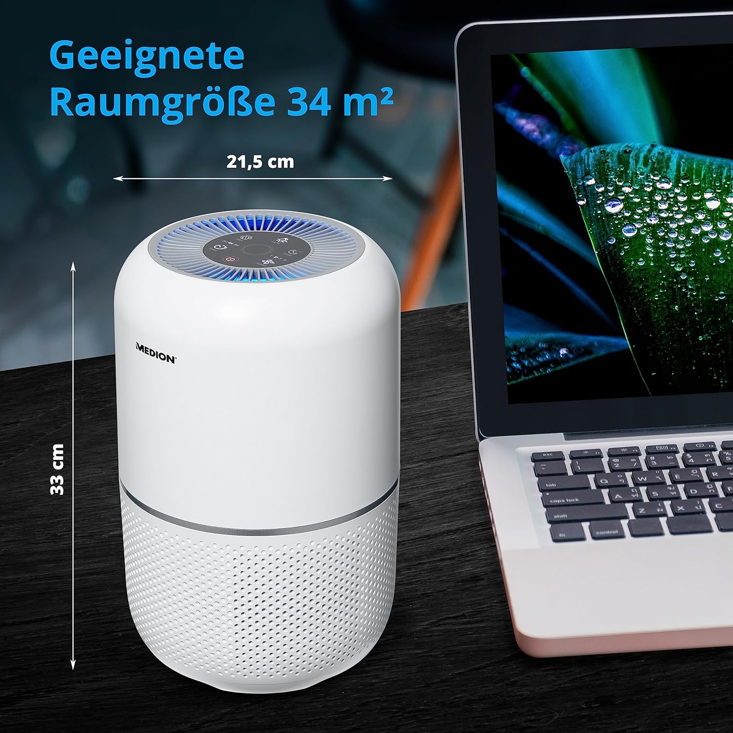 - Luftreiniger mit 3-Stufen-System, Filterung von Tierhaaren, Staub und Pollen, Reduzierung von Aerosolen, Allergikergeeignet.