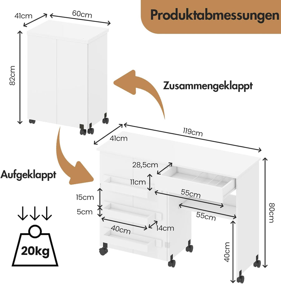 - 【Vielfältiger Stauraum】Mit einer grosszügigen Tischfläche (119 × 41 cm) bietet der Nähtisch Klappbar viel Platz für eine Nähmaschine und andere Arbeitsutensilien. Mit 4 offenen Ablageflächen und einer Schublade lassen sich Stoffe, Nadeln und