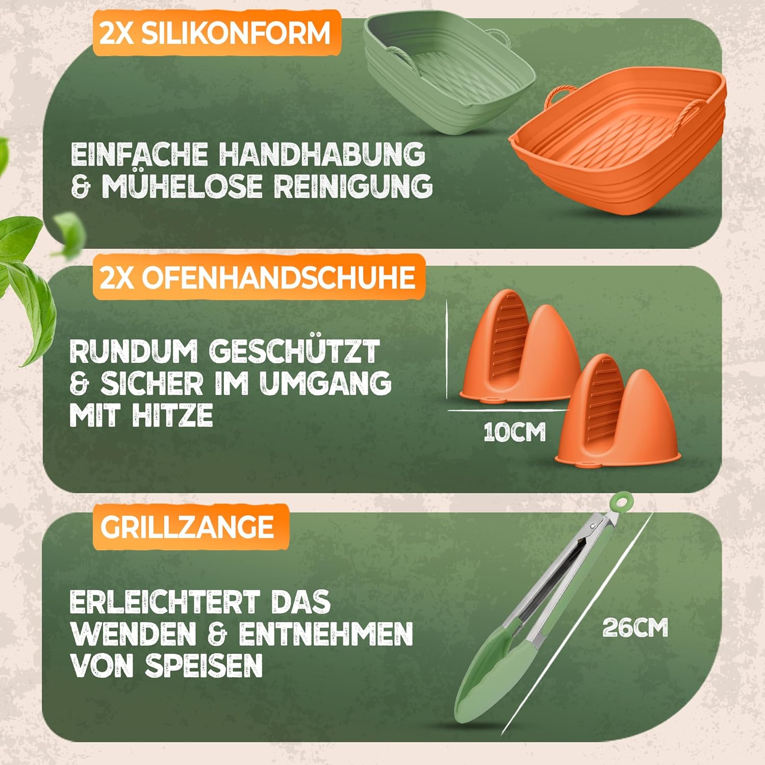 - SORGENFREI KOCHEN - Mit unserem faltbaren Silikonformen Starterset inkl. Küchenzange und Ofenhandschuhe für Heissluftfritteusen wird das Kochen zum Vergnügen! Die speziell entwickelten Formen erleichtern den Kocherlebnis und sorgen für