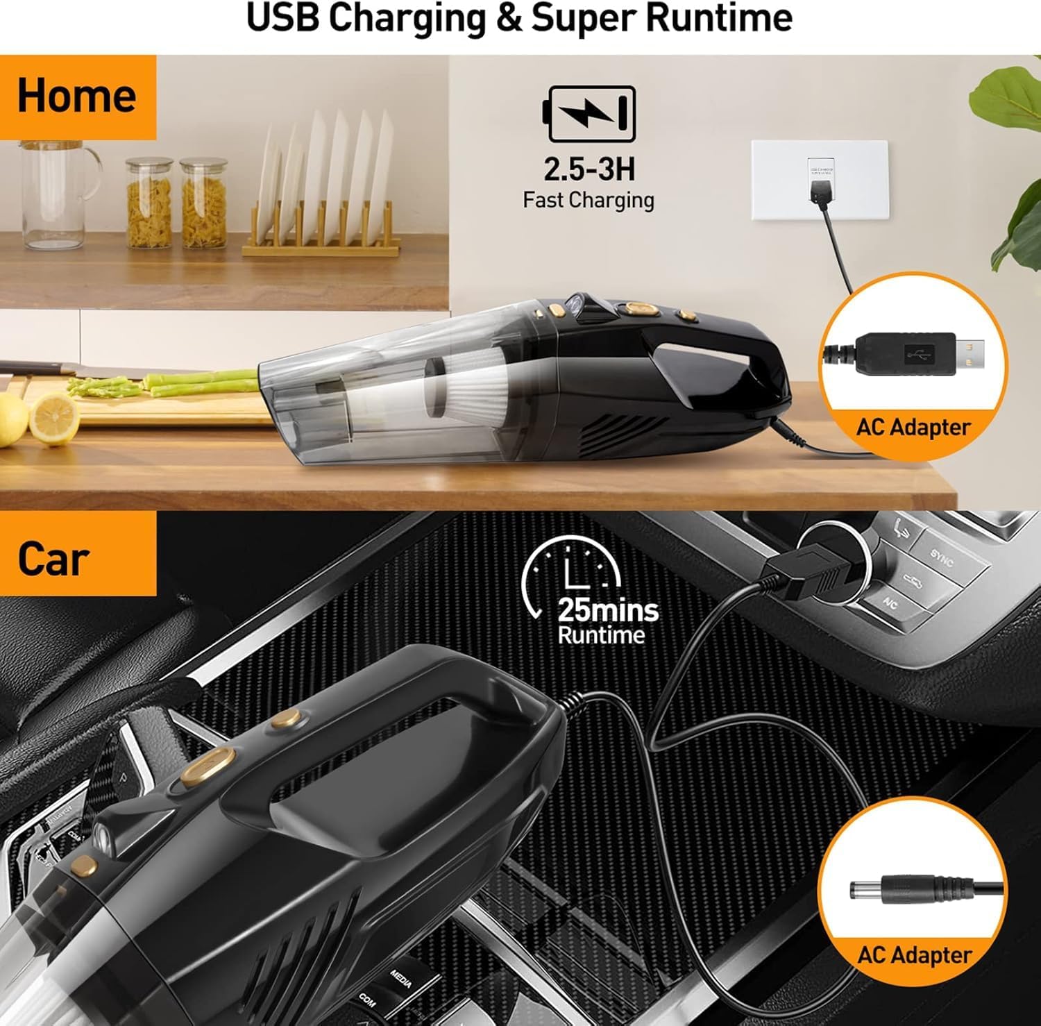 - 【auto Handstaubsauger leicht zu laden】Die eingebaute 2 * 2000mAh Lithium-Ionen-Batterie mit hoher Kapazität Schnellladetechnologie, die volle Ladung dauert ca. 4 Stunden und kann bis zu 30 Minuten betrieben werden, genug, um jede Ecke tief zu