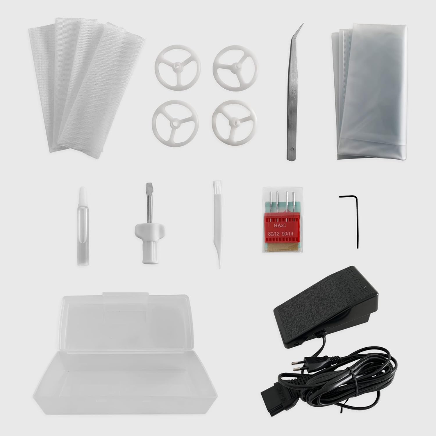 - 📦 GROSSER INHALT DES PAKETS - Overlock, Pedal, Abfallbehälter, Overlock-Frontplatte, Zubehörsatz: Reinigungsbürste, Schraubendreher, Pinzette, Sechskantschlüssel, Öl, Netze: 4 St., Spulenstoppscheibe: 4 St., Nadelsatz: X1. 80/12: 2 St., 90/14: 2